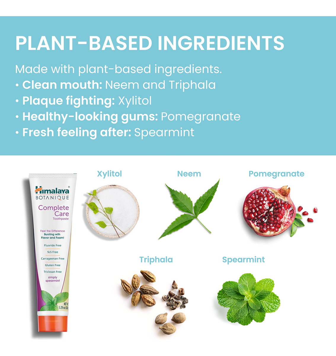 O creme dental Himalaya Simply Spearmint Complete Care é isento de flúor, triclosano, carragenina, SLS e glúten, e possui a textura espumosa e o sabor que você adora. Com a escovação regular, ajuda a combater a placa bacteriana, clareia os dentes e deixa a boca limpa e um hálito extra fresco. A hortelã nesta pasta de dentes ilumina os sorrisos com uma doçura fresca e suave. Em seguida, adicionamos Neem por sua famosa capacidade de limpeza e romã por seu conteúdo antioxidante e propriedades de combate à placa bacteriana, para que você obtenha uma excelente pasta de dente limpa com um toque doce de hortelã e sem comprometer a espuma e o sabor. – INGREDIENTES EXCLUSIVOS DE LIMPEZA E COMBATE A PLACA BACTERIANA: ingredientes vegetais, como o Neem, trabalham duro para manter toda a boca limpa, enquanto a romã ajuda a reduzir a placa bacteriana para dentes mais limpos e gengivas com aparência saudável. – DOCE, SABOR DE HORTELÃ: O óleo essencial de hortelã refresca seu hálito selvagem, com um toque suave e agradável de doçura, ao mesmo tempo que é suave. ingredientes trazem dentes mais brilhantes e um sorriso vencedor. – Uma pasta de dente limpa, sem comprometer a espuma e o sabor: finalmente, uma pasta de dente limpa, sem extras indesejados, mas que ainda tem um sabor e espuma maravilhosos! – LIVRE DAS COISAS QUE VOCÊ NÃO QUER: Sem flúor, sem triclosan, sem SLS (laurilsulfato de sódio), sem carragenina e sem glúten – SEM CRUELDADE: nos preocupamos com nossos amigos peludos. É por isso que nunca testamos nossa pasta de dente em animais.