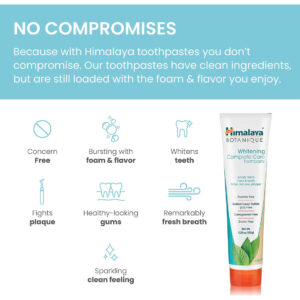 Faça com que escovar os dentes pareça a melhor parte do seu dia. O creme dental Himalaya Botanique Whitening Complete Care é um creme dental vegano clareador de dentes feito com ingredientes como Neem, uma planta tropical da Ásia, para limpar a boca e os dentes, enzimas de mamão e abacaxi para remover manchas superficiais para dentes mais brancos e romã para combater a placa bacteriana. Este creme dental diário é suave para dentes e gengivas, sem flúor, SLS ou cores ou sabores artificiais, mas ainda fornece a espuma de limpeza profunda e o sabor de menta que você adora. Em 1930, nosso fundador ficou fascinado com a sabedoria curativa das ervas e partiu em uma missão para levar a ciência ayurvédica tradicional ao mundo de forma contemporânea. A missão do Himalaia é criar felicidade em cada lar e bem-estar em cada coração, fornecendo conhecimento, conselhos e produtos que exemplifiquem o melhor da ciência indiana tradicional do Ayurveda, que remonta a mais de 3.000 anos. Os produtos da Himalaya são feitos com a máxima qualidade para atender aos seus altos padrões. De suplementos de ervas a cremes dentais botânicos e cuidados com o corpo e a pele, você encontrará produtos que melhoram sua vida diária e fazem você se sentir melhor. – Creme dental branqueador: revele um sorriso mais brilhante e branco. O creme dental Himalaya Botanique Whitening Complete Care é um creme dental sem flúor para dentes mais brancos, hálito fresco e redução da placa bacteriana. – Ingredientes botânicos: as enzimas vegetais do mamão e do abacaxi removem manchas superficiais para obter dentes mais brancos. Com Neem para manter a boca limpa e romã para reduzir a placa bacteriana. O Neem, uma planta tropical, é usada há séculos por suas propriedades de limpeza. – Sabor fresco e limpo: o sabor de menta faz com que seus dentes pareçam brilhantes, sem cores ou sabores artificiais. Fórmula suave para cuidados dentários diários com espuma de limpeza satisfatória para uma sensação de limpeza profunda após a escovação. – Fácil de usar: escove bem após as refeições ou pelo menos duas vezes por dia para obter um sorriso mais claro e branco que seja tão gostoso quanto bonito. Adicione esta pasta de dente vegana à sua rotina para mostrar seus dentes mais saudáveis e felizes. – Feito com bondade: a fórmula vegana e livre de crueldade faz desta uma adição saudável à sua rotina de higiene bucal. Sem flúor, glúten, triclosan, carragenina, SLS ou cores ou sabores artificiais. De uma empresa familiar, confiável desde 1930.