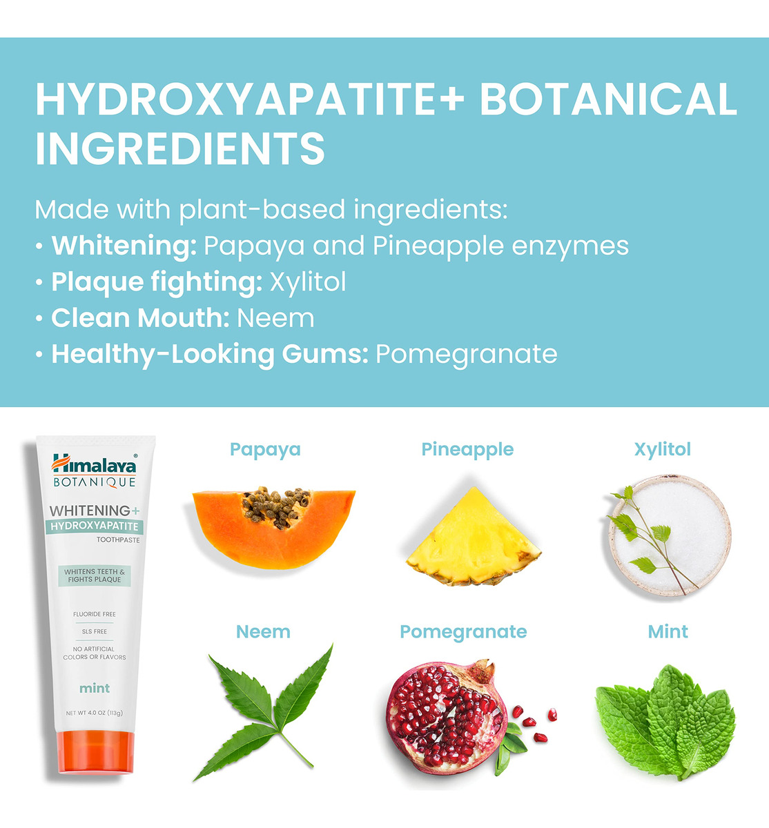 Creme dental Himalaya Botanique Whitening + Hydroxyapatite para dentes mais brancos e hálito mais fresco, combate a placa bacteriana com suporte de hidroxiapatita e sabor de menta, sem flúor, sem SLS e vegano, 4,0 onças, pacote com 2 — A diferença da nanohidroxiapatita: a hidroxiapatita (nHA) é a forma mineral de cálcio encontrada nos ossos, dentina e esmalte dentário, usada em pasta de dente em todo o mundo para ajudar a conquistar sorrisos. – INGREDIENTES DE LIMPEZA EXCLUSIVOS: Na pasta de dentes Himalaya Botanique Whitening + Hydroxyapatite, enzimas vegetais de mamão e abacaxi trabalham duro para remover manchas superficiais e dar Você branqueia os dentes e o Neem mantém sua boca limpa. – SABOR REFRESCANTE E FRESCO DE MENTA: o óleo essencial de menta faz com que toda a boca fique fresca, limpa e viva novamente, enquanto ingredientes suaves, como hidroxiapatita e vegetais, ajudam a clarear os dentes e a manter gengivas com aparência saudável. – LIMPO E SEM ALVEJANTE, SEM COMPROMETER A ESPUMA E O SABOR: Finalmente, um creme dental branqueador sem alvejante, sem abrasivos agressivos ou agressivos agentes espumantes, mas ainda tem um sabor e espuma maravilhosos! – LIVRE DE EXTRAS INDESEJADOS: O creme dental Himalaya Botanique Whitening + Hydroxyapatite é livre de flúor, sem SLS, sem carragenina, sem glúten, sem BPA, vegano e sem crueldade. Clareia os dentes sem cores ou sabores artificiais.