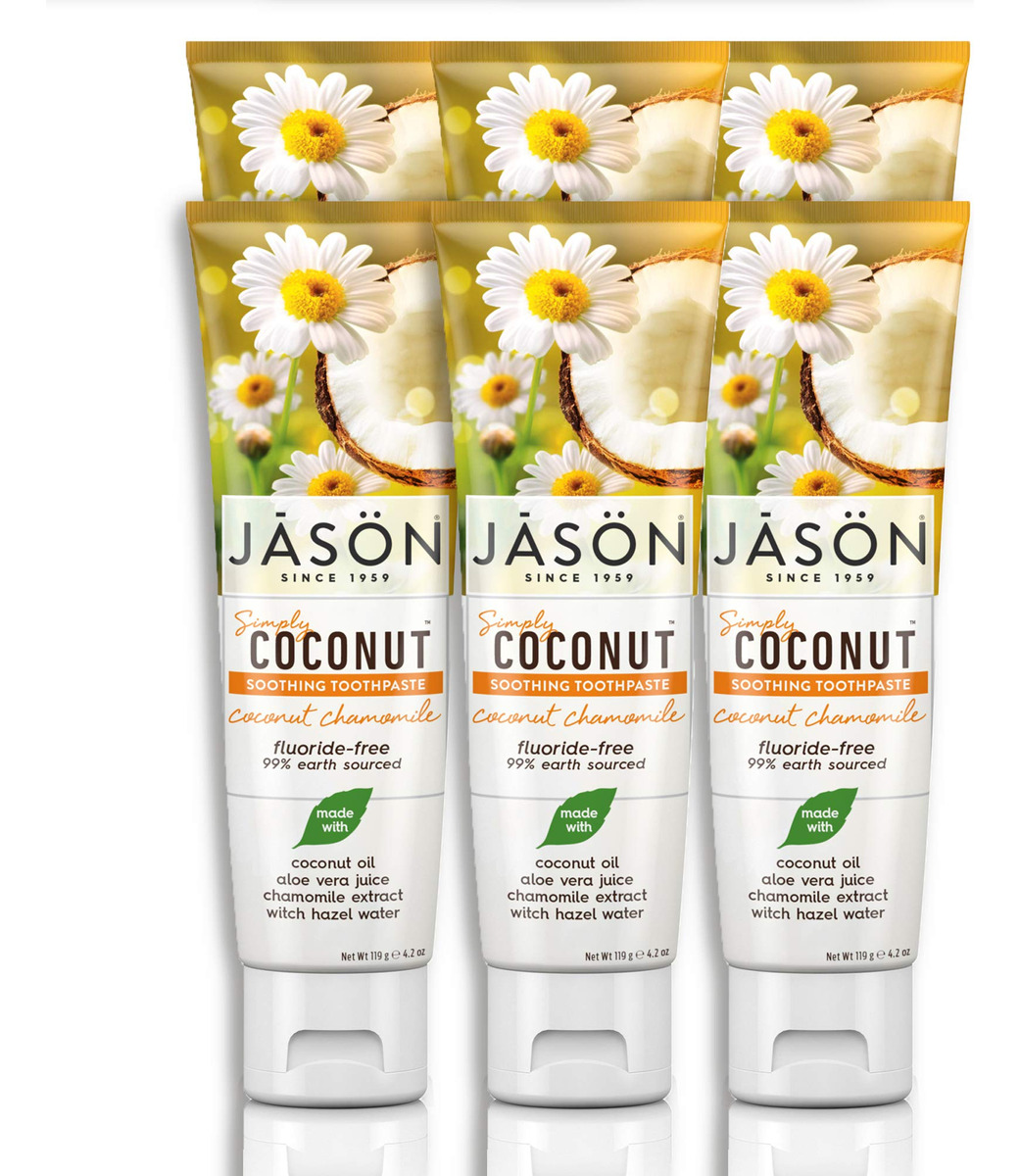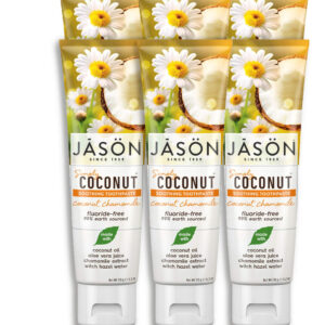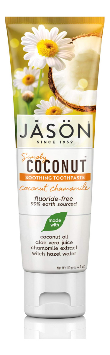 Pasta de dente calmante sem flúor Jason Simply Coconut, camomila de coco, 4,2 onças — Um tubo de 4,2 onças de creme dental calmante de camomila de coco Jason Simply Coconut — A fórmula 99% terrestre combate a placa bacteriana, acalma a irritação e deixa a boca limpa — Elaborada com uma mistura saudável de óleo de coco virgem, suco de aloe vera, extrato de camomila e água de hamamélis — Uma fórmula inspirada na natureza melhor, sem flúor, glúten, sacarina, adoçantes artificiais, parabenos, propilenoglicol e SLS – Sempre livre de crueldade, nunca testado em animais