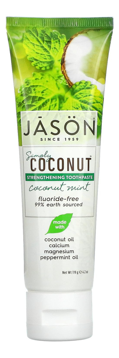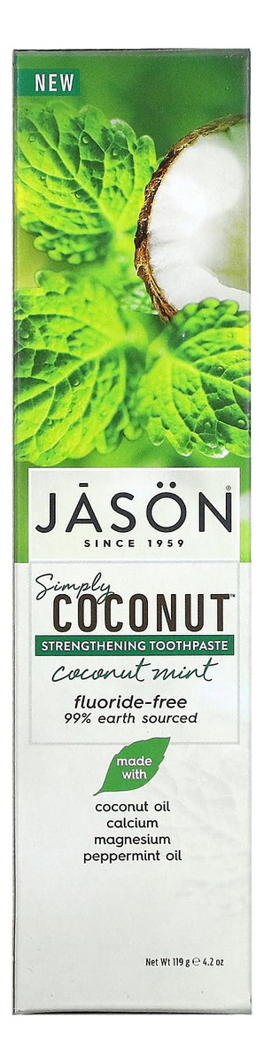 Creme dental Jason Simply Coconut Strengthening sem flúor, menta de coco, 4,2 onças – Um tubo de 4,2 onças de creme dental Jason Simply Coconut Strengthening Coconut Mint – A fórmula 99% terrestre combate a placa bacteriana, fortalece os dentes e deixa a boca limpa – Feita com uma mistura saudável de óleo de coco virgem, cálcio, magnésio e óleo de hortelã – Uma fórmula inspirada no melhor da natureza, sem flúor, glúten e sacarina, adoçantes artificiais, parabenos, propilenoglicol e SLS – Sempre livres de crueldade, nunca testados em animais