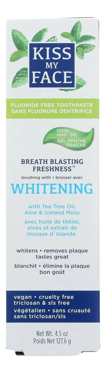 Creme dental Kiss My Face Super White Cool Mint Gel, sem SLS e sem flúor, remove a placa bacteriana e previne o tártaro, com adição de óleo de melaleuca, aloe e musgo islandês, 4,5 onças — PASTA DE DENTE VEGANA SEM SLS E SEM FLÚOR: A pasta dental Kiss My Face Triple Action Herbal Mint Gel é uma pasta de dente vegana sem SLS e sem flúor, que fornece o suporte oral necessário de que você precisa – REMOVE A PLACA, EVITA O TÁRTARO E EMBRANQUECE: O gel de hortelã herbal de ação tripla Kiss My Face é composto por ingredientes suaves, mas poderosos, que ajudam a remover a placa bacteriana, evitar o acúmulo de tártaro e clareie os dentes — Frescor de tirar o fôlego: desfrute da confiança de um sorriso super fresco, super branco e super mentolado; obtenha um frescor de tirar o fôlego, com o creme dental Kiss My Face Super White Gel Cool Mint Gel — MISTURA DE CLAREAMENTO DENTAL: Nosso creme dental clareador e clareador de dentes contém musgo islandês e sílica hidratada para ajudar a remover suavemente as manchas superficiais e clarear os dentes – KISS MY FACE: Temos orgulho de fabricar produtos de alta qualidade, por inteiro alguns produtos de cuidados pessoais; Nossa missão é combinar ingredientes saudáveis para criar os produtos de cuidados pessoais mais eficazes qualquer lugar