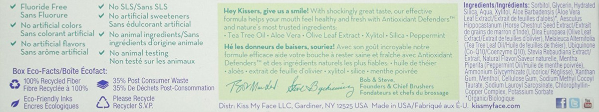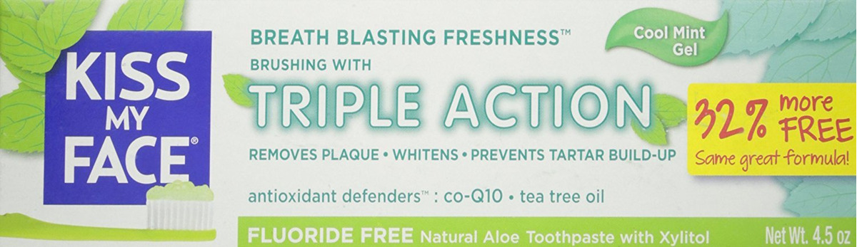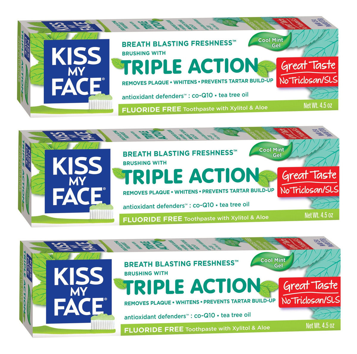 Gel de ação tripla Kiss My Face Pasta de dente sem flúor, 4,5 onças (pacote com 3) – Sem flúor, SLS e sabor artificial – A fórmula de ação tripla remove a placa bacteriana, embranquece e combate o acúmulo de tártaro. – Com xilitol, melaleuca, musgo islandês e extrato de folha de oliveira. – Fórmula vegana exclusiva com sabor incrível de menta fresca – Sem crueldade – formulada com ingredientes sem glúten, não flúor, sabores artificiais e SLS – também creme dental em gel sem parabenos