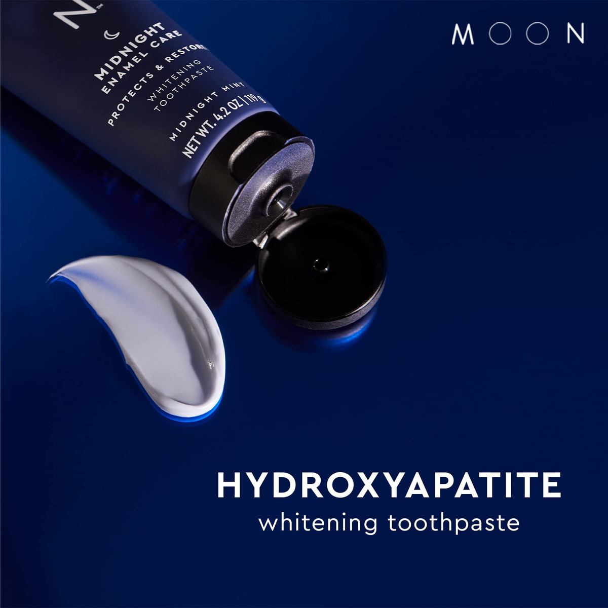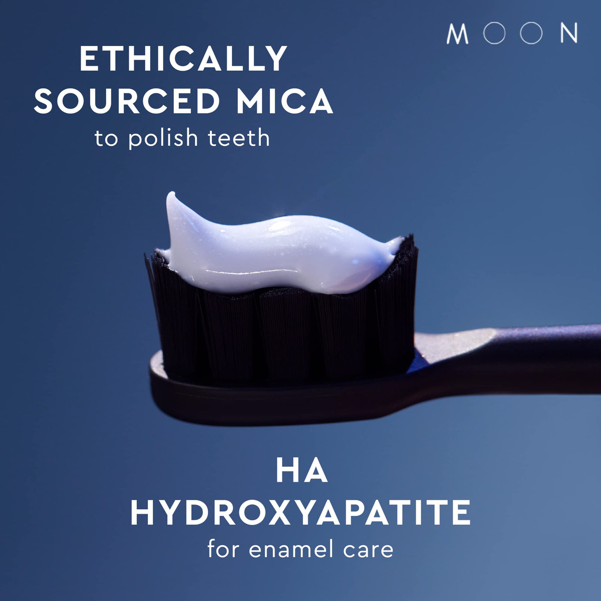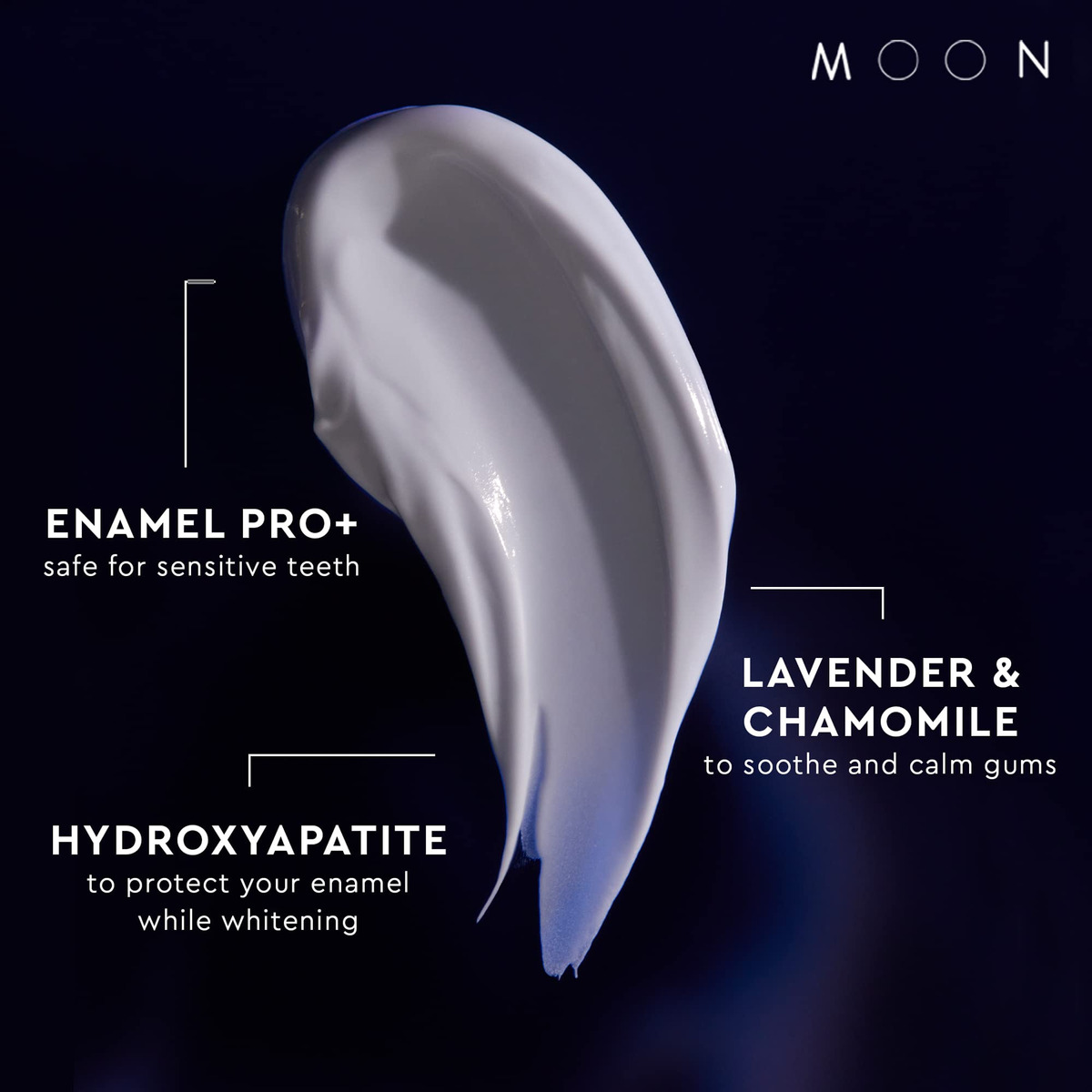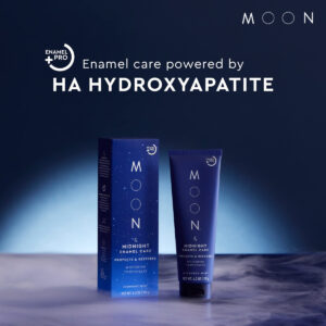 Esta fórmula de clareamento de creme dental sem flúor é alimentada por Enamel Pro +. O Enamel Pro+ está equipado para clarear os dentes e ajuda esse creme dental saudável para adultos a clarear e remover suavemente as manchas nos dentes sensíveis. Este também é um ótimo creme dental sem flúor para adultos que procuram um creme dental não tóxico que possa ajudar a apoiar a remineralização dentária, pois o suave removedor de manchas de dentes também contém hidroxiapatita. A hidroxiapatita é usada há muito tempo em produtos diários para cuidados dentários e higiene bucal porque é um mineral conhecido por ajudar a proteger contra cáries enquanto restaura e remineraliza o esmalte. O creme dental sem flúor surge como uma pasta azul pastel macia e cintilante porque usa mica de origem ética para ajudar a polir os dentes e obter um sorriso limpo. O creme dental sem glúten tem um sabor de menta à meia-noite que inclui notas de lavanda e camomila para ajudar a acalmar as gengivas antes de dormir. O creme dental de remineralização também foi projetado para oferecer uma experiência de baixa espuma e sem sulfato, que pode ajudar a reduzir a irritação nas gengivas durante a escovação. O creme dental branqueador sem flúor é um ótimo creme dental não tóxico para adultos porque é um creme dental sem SLS que não contém parabenos, ftalatos, produtos de origem animal ou sabores artificiais. – Ajude a clarear os dentes enquanto você dorme – Formulamos este creme dental de hidroxiapatita sem flúor e adicionamos nosso sabor refrescante de menta da meia-noite com notas de lavanda e camomila para ajudar a acalmar as gengivas antes de dormir. – Remoção suave de manchas para dentes sensíveis – Este é um ótimo creme dental clareador de dentes para adultos que procuram uma fórmula suave que possa ajuda a clarear dentes sensíveis. É alimentado pelo Enamel Pro+ e projetado para ajudar a remover manchas superficiais durante a noite. – Proteja e restaure o esmalte – Criamos este creme dental remineralizante com hidroxiapatita porque o mineral é conhecido por ajudar a proteger contra cáries enquanto restaura e remineraliza o esmalte. – Vegano e livre de crueldade – Este creme dental branqueador sem flúor oferece uma experiência com baixo teor de espuma e sem sulfato que pode ajudar a reduzir a irritação nas gengivas durante a escovação. A pasta azul pastel macia e cintilante usa mica de origem ética para ajudar a polir os dentes. – Oral Care Reimagined – MOON acredita que a beleza começa com seu sorriso. Estamos reimaginando a higiene bucal redefinindo o que significa cuidar dos dentes. Projetos melhores, ingredientes melhores e produtos de clareamento dental melhores para você, feitos sem parabenos, ftalatos ou sabores artificiais.