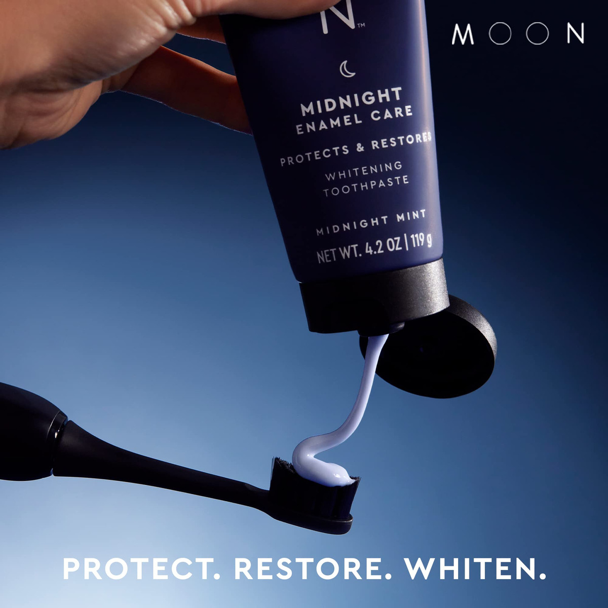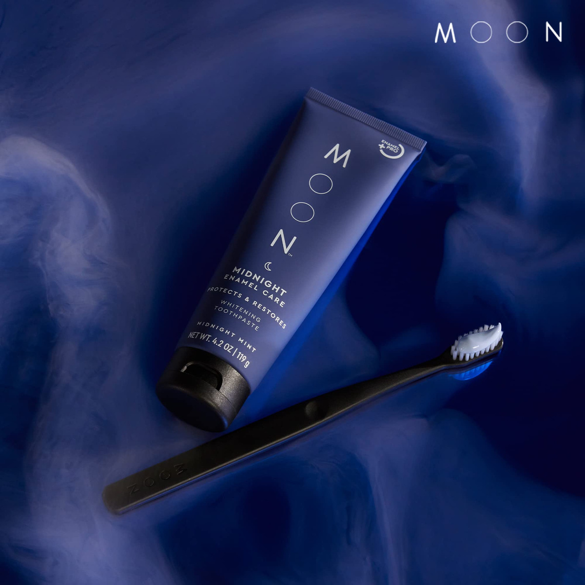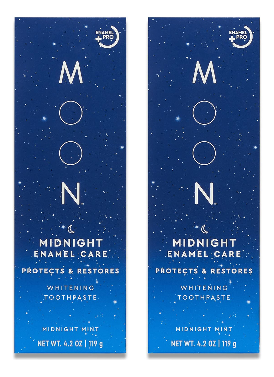 Esta fórmula de clareamento de creme dental sem flúor é alimentada por Enamel Pro +. O Enamel Pro+ está equipado para clarear os dentes e ajuda esse creme dental saudável para adultos a clarear e remover suavemente as manchas nos dentes sensíveis. Este também é um ótimo creme dental sem flúor para adultos que procuram um creme dental não tóxico que possa ajudar a apoiar a remineralização dentária, pois o suave removedor de manchas de dentes também contém hidroxiapatita. A hidroxiapatita é usada há muito tempo em produtos diários para cuidados dentários e higiene bucal porque é um mineral conhecido por ajudar a proteger contra cáries enquanto restaura e remineraliza o esmalte. O creme dental sem flúor surge como uma pasta azul pastel macia e cintilante porque usa mica de origem ética para ajudar a polir os dentes e obter um sorriso limpo. O creme dental sem glúten tem um sabor de menta à meia-noite que inclui notas de lavanda e camomila para ajudar a acalmar as gengivas antes de dormir. O creme dental de remineralização também foi projetado para oferecer uma experiência de baixa espuma e sem sulfato, que pode ajudar a reduzir a irritação nas gengivas durante a escovação. O creme dental branqueador sem flúor é um ótimo creme dental não tóxico para adultos porque é um creme dental sem SLS que não contém parabenos, ftalatos, produtos de origem animal ou sabores artificiais. – Ajude a clarear os dentes enquanto você dorme – Formulamos este creme dental de hidroxiapatita sem flúor e adicionamos nosso sabor refrescante de menta da meia-noite com notas de lavanda e camomila para ajudar a acalmar as gengivas antes de dormir. – Remoção suave de manchas para dentes sensíveis – Este é um ótimo creme dental clareador de dentes para adultos que procuram uma fórmula suave que possa ajuda a clarear dentes sensíveis. É alimentado pelo Enamel Pro+ e projetado para ajudar a remover manchas superficiais durante a noite. – Proteja e restaure o esmalte – Criamos este creme dental remineralizante com hidroxiapatita porque o mineral é conhecido por ajudar a proteger contra cáries enquanto restaura e remineraliza o esmalte. – Vegano e livre de crueldade – Este creme dental branqueador sem flúor oferece uma experiência com baixo teor de espuma e sem sulfato que pode ajudar a reduzir a irritação nas gengivas durante a escovação. A pasta azul pastel macia e cintilante usa mica de origem ética para ajudar a polir os dentes. – Oral Care Reimagined – MOON acredita que a beleza começa com seu sorriso. Estamos reimaginando a higiene bucal redefinindo o que significa cuidar dos dentes. Projetos melhores, ingredientes melhores e produtos de clareamento dental melhores para você, feitos sem parabenos, ftalatos ou sabores artificiais.