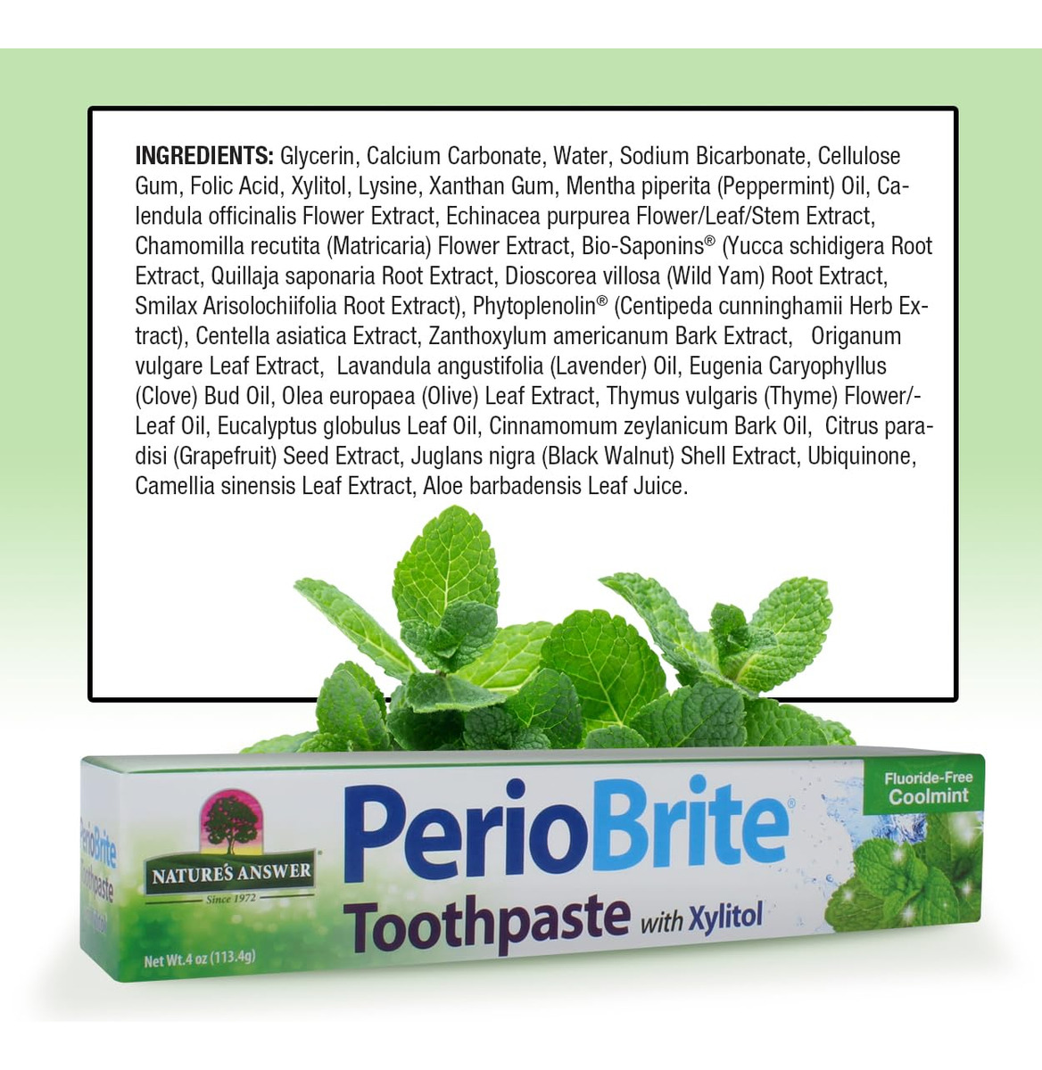 PerioBrite é sem glúten, sem flúor, sem soja/vegetariano, não contém laurilsulfato de sódio. Periobrite não tem adoçantes artificiais, não tem conservantes artificiais, ilumina naturalmente, acalma e refresca com todos os ingredientes naturais… é adequado para toda a família. Sorria naturalmente! Livre de crueldade, não testado em animais, o creme dental clareador natural PerioBrite, formulado por dentistas holisticamente balanceados, contém fitoplenolina, um extrato de ervas patenteado que demonstrou em estudos laboratoriais independentes promover a vitalidade celular. Ervas calmantes artesanais, conhecidas por sua ação de limpeza, são combinadas com CoQ10, ácido fólico, orégano, canela e cravo para promover o bem-estar dos tecidos e gengivas. O PerioBrite ilumina naturalmente os dentes enquanto deixa seu hálito fresco e limpo, energizando toda a boca com uma sensação fresca, cintilante e mentolada. – O creme dental Periobrite Coolmint da Nature's Answer é totalmente natural – Feito com Co Q10 e ácido fólico – O PerioBrite contém óleos essenciais de ervas e não contém flúor – Creme dental clareador natural formulado por dentistas – Sem glúten. Sem flúor. Sem soja/vegetariano. Sem laurilsulfato de sódio. Sem adoçantes artificiais. Sem conservantes artificiais.