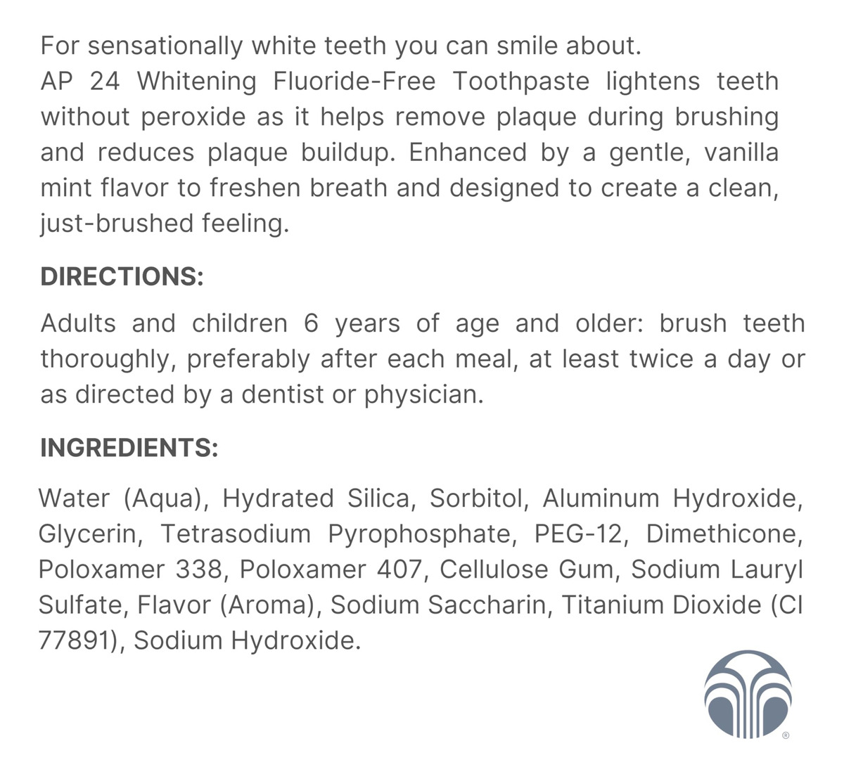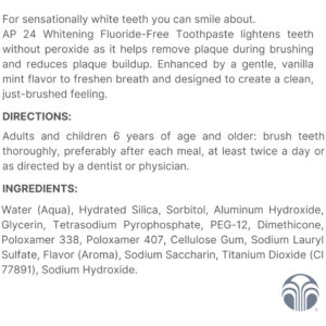 Experimente um sorriso mais brilhante com o creme dental branqueador com flúor AP 24. Este creme dental foi especialmente desenvolvido para clarear os dentes sem o uso de peróxido, garantindo uma abordagem segura e suave ao clareamento dos dentes. Além de suas propriedades clareadoras, esse creme dental também se destaca na higiene bucal. Promove ativamente menos cáries e ajuda a combater a formação de placas, promovendo uma excelente saúde bucal. A deliciosa fórmula de baunilha e menta deixa seu hálito fresco, proporcionando uma sensação de limpeza, recém-escovada, que dura o dia todo. Um produto versátil que diminui a aparência das manchas superficiais, ajudando você a obter um sorriso mais brilhante sem produtos químicos agressivos. Sua fórmula exclusiva não apenas ilumina os dentes, mas também remove manchas e evita o acúmulo de placa. Com um toque suave, limpo e fresco de longa duração, este creme dental é seu companheiro diário de higiene bucal. Possui AP-24, um ingrediente exclusivo que ajuda a manter uma sensação de boca fresca e lisa durante todo o dia. O sabor refrescante de baunilha e menta, sua marca registrada, aprimora sua experiência de escovação. O que diferencia esse creme dental é seu compromisso com a saúde bucal sem o uso de peróxidos nocivos. Inclui uma mistura de surfactantes no AP 24 Blend, que é um agente de combate à placa que deixa sua boca mais lisa e fresca por mais tempo. A mistura exclusiva de sílica hidratada e hidróxido de alumínio atua como abrasivos suaves, polindo e suavizando os dentes para reduzir as manchas superficiais sem corroer o esmalte. – Fórmula sem flúor: esta pasta de dente não contém flúor, o que a torna uma ótima opção para quem deseja evitar esse ingrediente. – Benefícios do clareamento: a fórmula contém ingredientes que ajudam a clarear os dentes e remover manchas. – Sabor de baunilha e menta: O A pasta de dente tem um sabor refrescante de baunilha e menta que é agradável de usar. – Pasta de dente para adultos: esta pasta de dente é formulada especificamente para adultos e não é recomendado para crianças. – Pacote com 3: Este creme dental vem em um pacote de 3 tubos, fornecendo um suprimento duradouro.