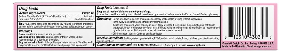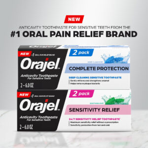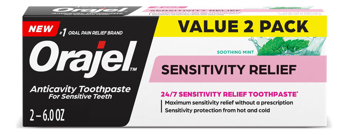 Pasta de dente Orajel Sensitivity Relief, sabor calmante de menta, pasta de dente anticavitária sensível ao flúor para máximo alívio sem receita médica, 6,0 onças (pacote com 2) — Dois tubos de pasta de dente de 6,0 onças para máximo alívio sem receita médica — Esta pasta de dente sensível à cárie é especialmente formulada para oferecer alívio da sensibilidade 24 horas por dia, 7 dias por semana, e proteção contra calor, frio, ácidos e doces com escovação duas vezes ao dia, oferecendo máxima proteção de sensibilidade sem prescrição – Faça deste creme dental com flúor parte de sua rotina diária de saúde bucal; cada tubo fornece alívio da sensibilidade e proteção da cárie, ao mesmo tempo que fortalece o esmalte e refresca o hálito – Este creme dental de menta para cuidar dos dentes sensíveis tem um sabor calmante de menta, tornando-o um purificador de hálito ideal para um hálito fresco duradouro – Para obter melhores resultados, use este creme dental anticavitário para dentes sensíveis aplicando uma tira de 1 polegada em uma escova de dentes de cerdas macias e escovando por pelo menos 1 minuto duas vezes ao dia (manhã e noite); certifique-se de escove todas as áreas sensíveis dos dentes