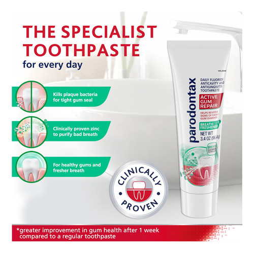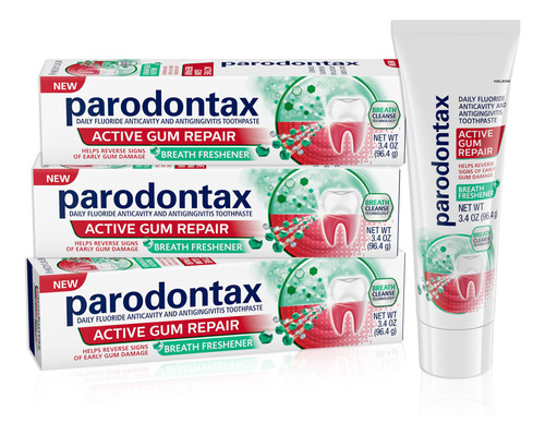 Creme dental Parodontax Active Gum Repair, tubos de 3 x 3,4 onças – Três tubos de 3,4 onças de creme dental Parodontax Active Gum Repair Breath Repair, um creme dental antigengivite e anticavidade – Clinicamente comprovado que ajuda a reverter os 4 sinais de problemas gengivais precoces: sangramento, vermelhidão, inchaço e mau hálito (1) – Proteção diária contra o mau hálito (3) para ajudar a remover o mau hálito agora e trate-o para redução a longo prazo (3) – Projetado especialmente para reduzir o mau hálito em 75% em pessoas com sangramento nas gengivas (4) – Frasco, tampa e cartão recicláveis – Escove por dois minutos, duas vezes ao dia, deixando você com uma sensação de limpeza e hálito fresco