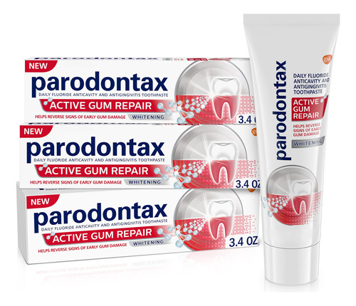 Pasta de dente branqueadora Parodontax Active Gum Repair para sangramento gengival – Tubo de 3×3,4 onças – Três tubos de 3,4 onças de creme dental clareador Parodontax Active Gum Repair, um creme dental para anticavidade e antigengivite – Creme dental que ajuda a reduzir o sangramento gengival e ajuda a clarear os dentes – O creme dental branqueador mata a placa bacteriana na linha da gengiva para ajudar a reverter os sinais precoces de danos na gengiva – O creme dental Parodontax Active Gum Repair formulado com fluoreto de estanho é três vezes mais eficaz do que um creme dental com monofluorofosfato de sódio na remoção da placa bacteriana, a principal causa de sangramento nas gengivas – Escove por dois minutos, duas vezes ao dia
