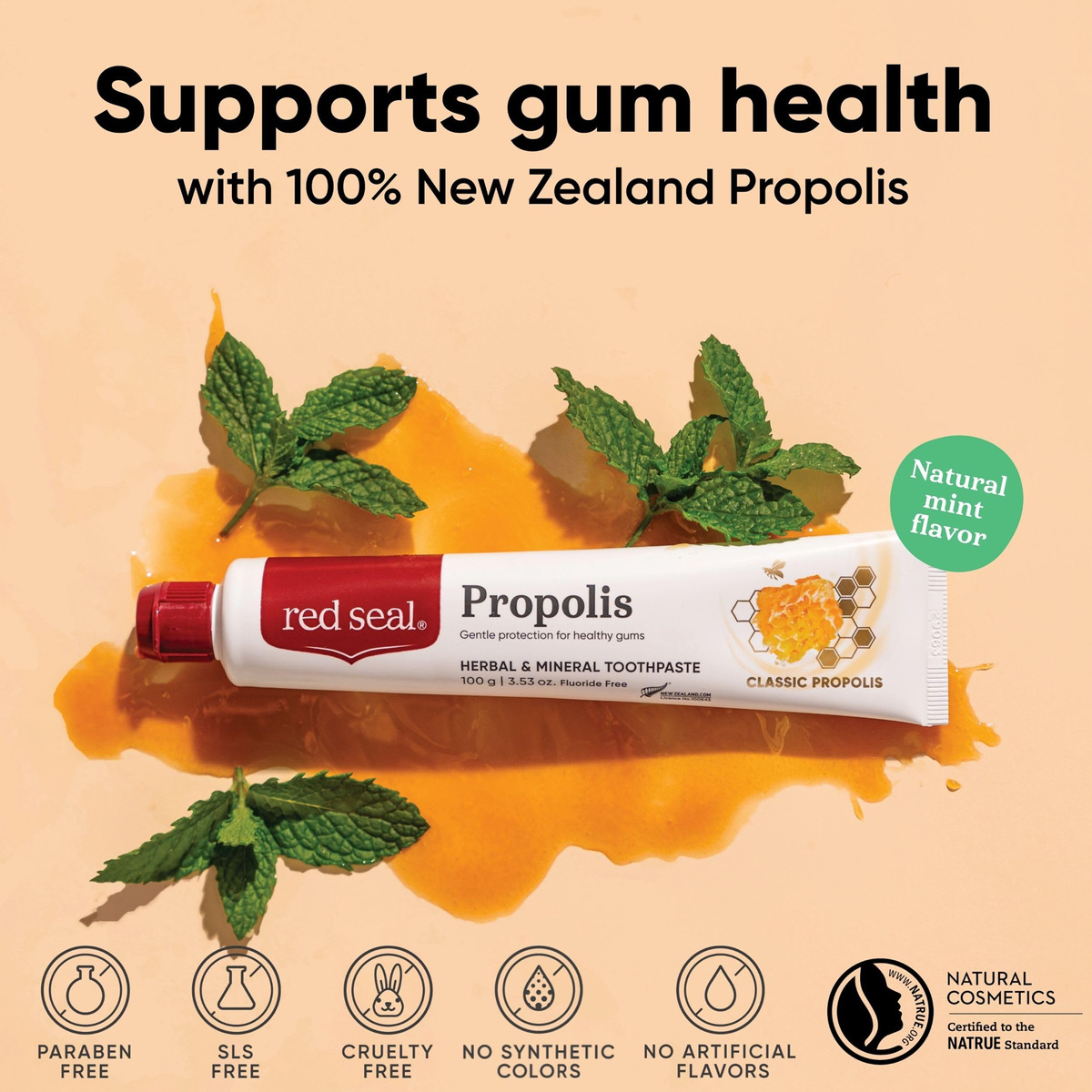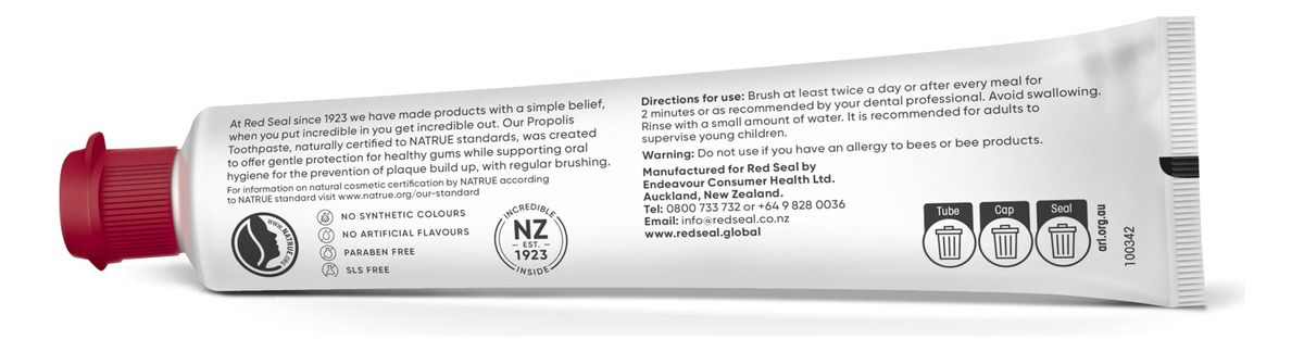 Cuidado delicado das gengivas para uma saúde bucal duradoura Desfrute do cuidado calmante de nosso creme dental mineral e herbal Red Seal Propolis, meticulosamente elaborado para fornecer proteção suave às gengivas. Enriquecido com os benefícios naturais da própolis, este creme dental sem flúor foi projetado para promover gengivas saudáveis, garantindo uma base sólida para sua saúde bucal geral. Nosso creme dental contém própolis, uma resina natural produzida por abelhas conhecidas por suas propriedades antimicrobianas e anti-inflamatórias. Este poderoso ingrediente ajuda a fortalecer suas gengivas, fornecendo um escudo contra possíveis infecções. Experimente o efeito calmante da própolis, pois ela funciona em harmonia com as defesas do corpo, oferecendo uma camada de proteção que vai além dos cuidados bucais comuns. Diga adeus à sensibilidade – Diga adeus ao desconforto das gengivas sensíveis. O creme dental Red Seal Propolis é formulado especificamente para aliviar a sensibilidade, deixando você com uma sensação refrescante após cada uso. Desfrute da confiança que vem com um sorriso radiante e gengivas que parecem cuidadas e resilientes. Pureza natural: uma pasta de dente sem aditivos sintéticos Escolha uma pasta de dente sem sls que cuide da sua saúde bucal e, ao mesmo tempo, esteja atento ao que contém. O creme dental Red Seal Propolis Herbal & Mineral é uma celebração da pureza, sem cores sintéticas, sabores artificiais e aditivos nocivos. Mergulhe em uma experiência de creme dental sem flúor, tão limpa e natural quanto seu sorriso. – Proteção suave da gengiva: adote o cuidado calmante da pasta de dente de própolis Red Seal, projetada para fornecer proteção suave às gengivas, promovendo sua saúde e vitalidade. – Sem sintéticos: experimente um cuidado bucal puro com uma fórmula sem cores sintéticas e sabores artificiais, oferecendo uma alternativa natural e refrescante à pasta de dente convencional. – Pará Livre de crueldade e livre de crueldade: fique tranquilo sabendo que nossa pasta de dente não é apenas livre de parabenos, mas também livre de crueldade, alinhado com nosso compromisso com a higiene bucal ética e responsável. – Natural certificado pela NATRUE: elaborado com precisão usando ingredientes naturais certificados pela NATRUE, nosso creme dental garante uma experiência de higiene bucal pura e autêntica, refletindo nosso compromisso com a qualidade e a transparência. – Pasta de dente sem flúor: escolha uma abordagem holística da saúde bucal com nossa fórmula de creme dental sem flúor. O creme dental Red Seal garante eficácia sem comprometer sua preferência por cuidados bucais sem flúor.