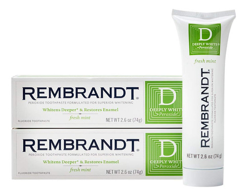 Pasta de dente branqueadora Rembrandt Deeply White + com peróxido, sabor de menta fresca, 2,6 onças (pacote com 2) – A pasta de dente branqueadora Deeply White + com peróxido clareia os dentes por dentro e restaura o esmalte – O peróxido de liberação rápida clareia visivelmente as manchas profundas nos dentes em contato – O fluoreto de sódio restaura o esmalte dentário para fortalecer os dentes e evitar cáries – O sabor fresco de menta deixa sua boca limpa e revigorada – Seguro para uso diário usar