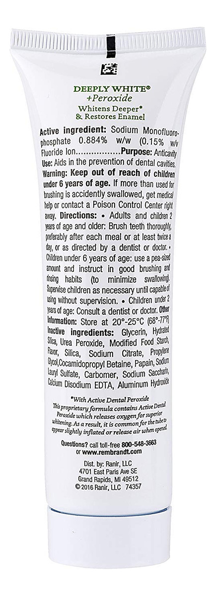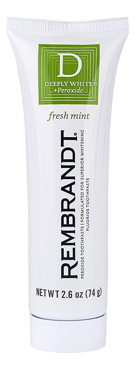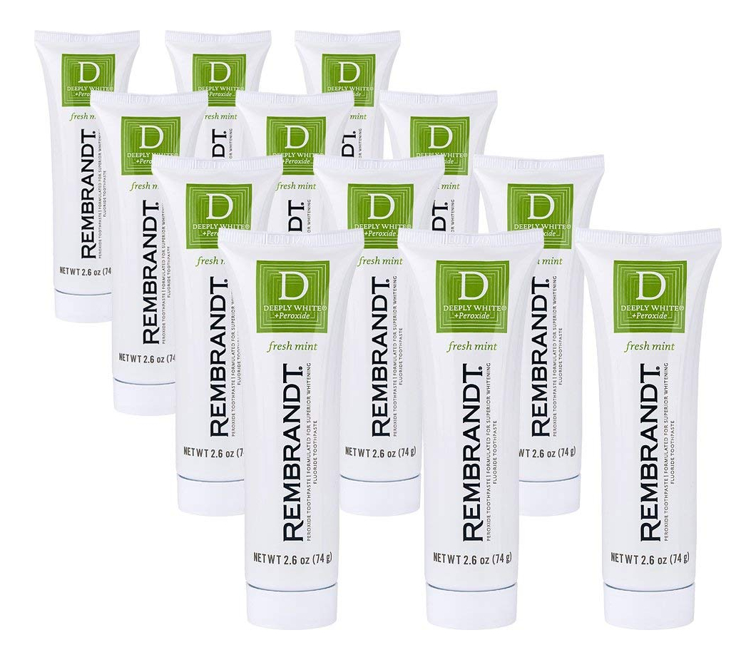 Creme dental branqueador Rembrandt Deeply White + com peróxido, sabor de menta fresca, 2,6 onças (pacote com 12) — O creme dental branqueador Deeply White + com peróxido clareia os dentes por dentro e restaura o esmalte – O peróxido de liberação rápida clareia visivelmente as manchas profundas nos dentes em contato – O fluoreto de sódio restaura o esmalte dentário para fortalecer os dentes e evitar cáries – O sabor fresco de menta deixa sua boca limpa e revigorada – Seguro para uso diário usar