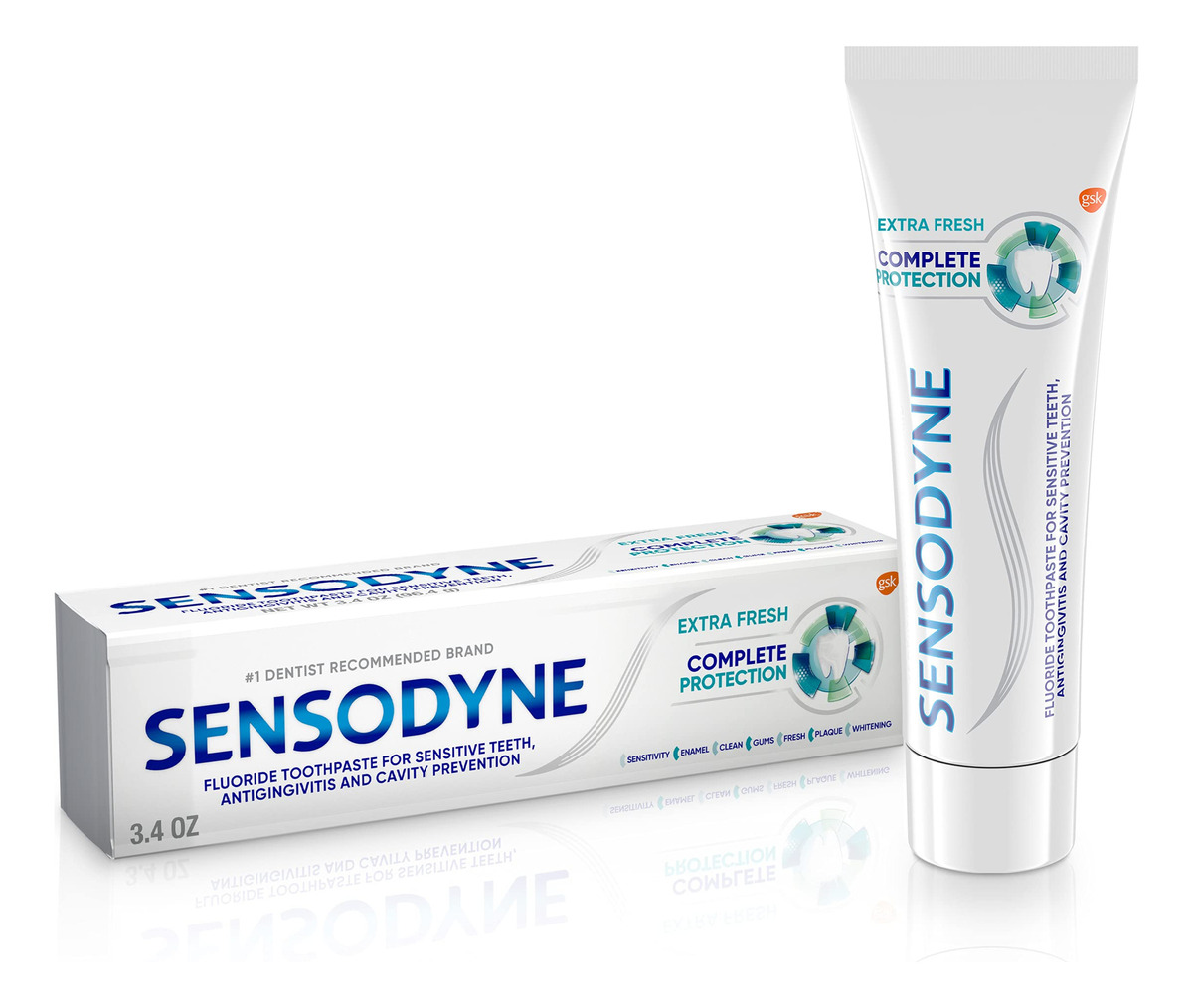Pasta de dente sensível Sensodyne Complete Protection para gengivite, tratamento de dentes sensíveis, extra fresca – 3,4 onças – Um tubo de 3,4 onças de pasta de dente sensível Sensodyne Complete Protection Extra Fresh para gengivite, tratamento de dentes sensíveis – Formulada para fornecer todas as necessidades diárias de creme dental em um creme dental completo para antigengivite – Pasta de dente anticavity que fortalece o esmalte e alivia a dor sensível, oferecendo proteção contra sensibilidade ao relógio – Creme dental para saúde gengival que ajuda a prevenir cáries e restaura a brancura natural de seu dentes, deixando você com um hálito fresco – O creme dental Sensodyne Complete Protection para dentes sensíveis é especialmente formulado para oferecer vários benefícios em um creme dental completo – Pasta de dente extra fresca para uma sensação de limpeza e hálito fresco – Escove por dois minutos, duas vezes ao dia