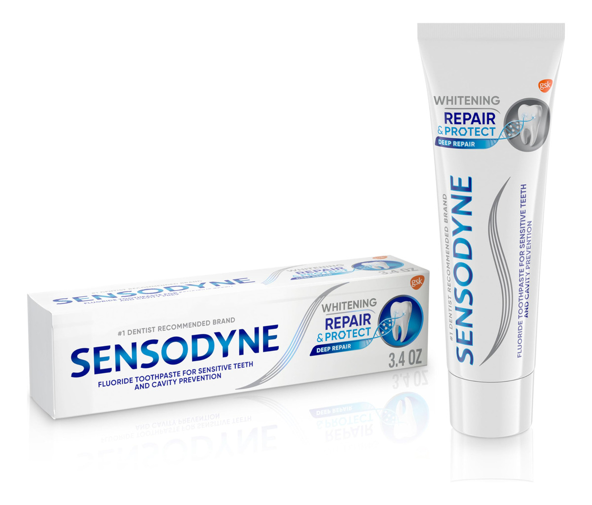 Creme dental branqueador Sensodyne Repair and Protect, creme dental para dentes sensíveis e prevenção de cáries, 3,4 onças – Um tubo de 3,4 onças de creme dental clareador Sensodyne Repair and Protect – Pasta de dente para dentes sensíveis da marca número um recomendada por dentistas para dentes sensíveis – O creme dental com flúor Sensodyne cria uma camada reparadora dentro dos pequenos túbulos das áreas sensíveis dos dentes (2, 3) – A fórmula de fluoreto de estanho oferece proteção duradoura contra a sensibilidade com escovação duas vezes ao dia, para que você possa aproveitar a vida sem se preocupar com sensibilidade (1) – Creme dental com um ingrediente clinicamente comprovado para alívio da sensibilidade e proteção duradoura (1) – Este creme dental repara áreas sensíveis dos dentes para que você possa voltar às coisas que mais gosta de comer (2, 3) – Este creme dental clareador refresca o hálito
