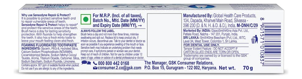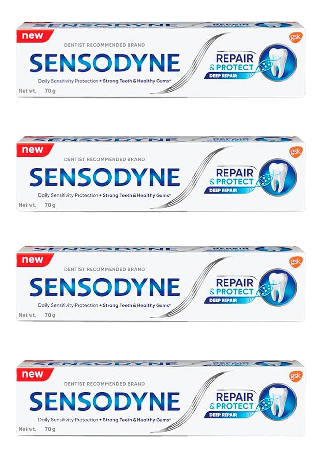 Se você tem dentes sensíveis, mudar para um creme dental sensível, como o creme dental Sensodyne, pode fazer uma grande diferença não apenas na diversão da vida cotidiana, mas também na saúde bucal geral. O creme dental Sensodyne é o creme dental recomendado pelo dentista para sensibilidade, oferecendo uma variedade de cremes dentais especificamente formulados. O creme dental Sensodyne funciona para aliviar a dor dentária causada por dentes sensíveis e fornece proteção duradoura durante todo o dia, todos os dias, quando usado conforme as instruções. Desde que foi introduzido em 1961, o creme dental Sensodyne se tornou um creme dental sensível bem reconhecido por dentistas de todo o mundo. De fato, nos EUA, 9 em cada 10 dentistas pesquisados recomendam o creme dental Sensodyne. O creme dental Sensodyne tem alívio clinicamente comprovado para dentes sensíveis. Mais dentistas recomendam o creme dental Sensodyne do que qualquer outra marca. O Sensodyne “Repair & Protect” contém a tecnologia patenteada NovaMin, que busca e forma uma camada semelhante a um dente sobre áreas vulneráveis do dente onde a dentina é exposta. Use duas vezes ao dia, todos os dias, para ajudar continuamente a reparar (o reparo fornece alívio clinicamente comprovado com a escovação duas vezes ao dia), fortalecer e proteger os dentes da sensibilidade. – Reparar e proteger: a tecnologia NovaMin ajuda a reparar e fortalecer o esmalte dentário. – Alívio de dentes sensíveis: acalma e reduz a sensibilidade de dentes sensíveis. – Limpo e fresco: remove a placa bacteriana e deixa os dentes limpos. – Pasta de dentes para adultos: formulada especificamente para adultos e dentes sensíveis. – 4 tubos: contém 4 tubos de pasta de dente para uso regular.
