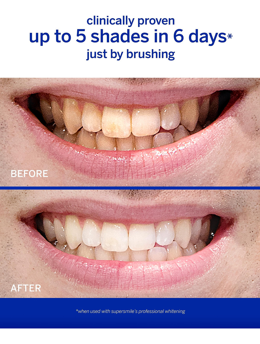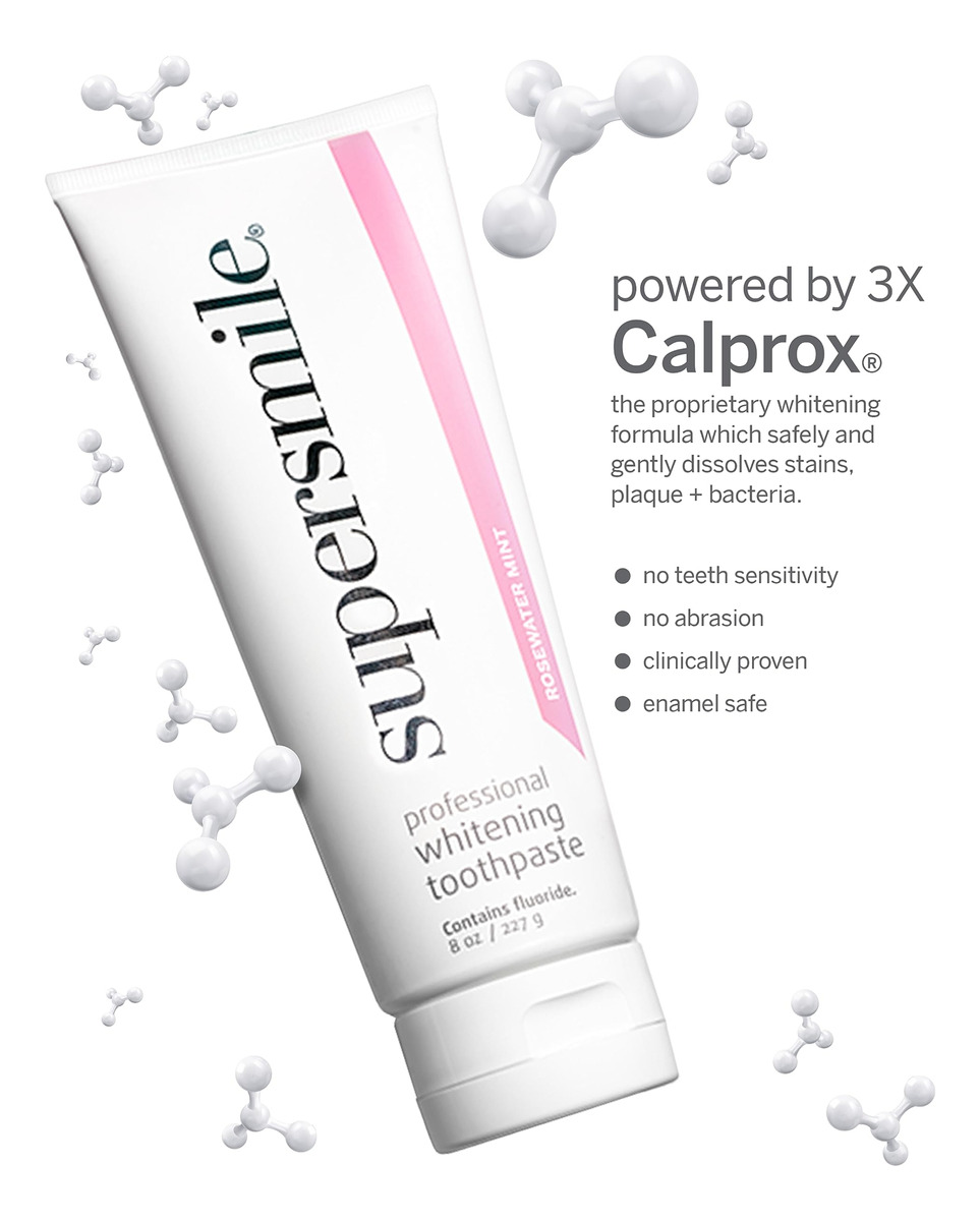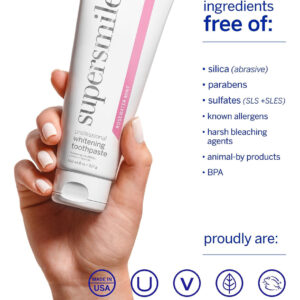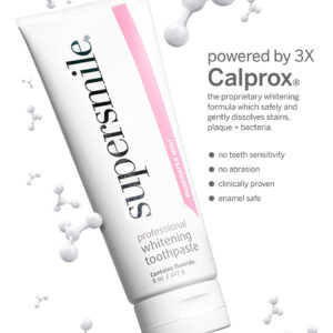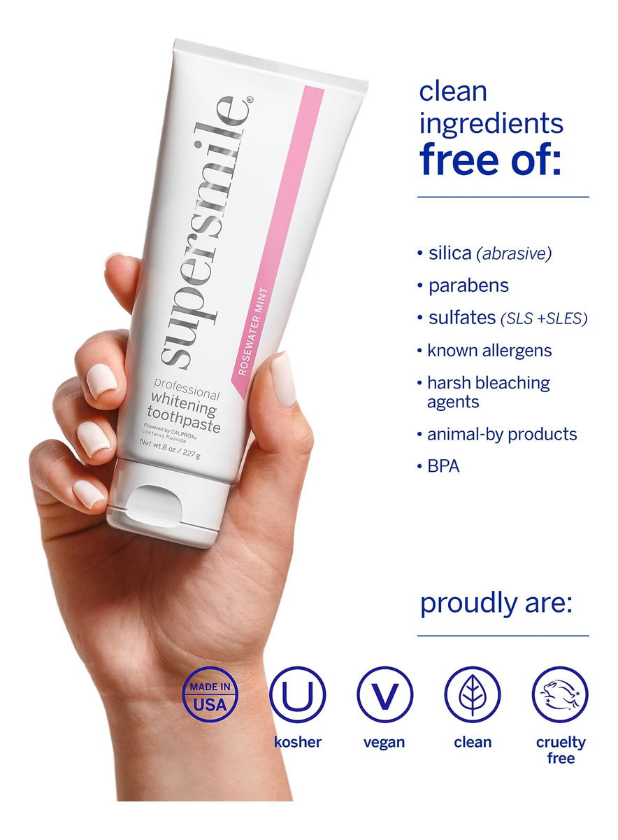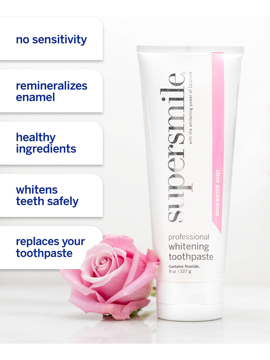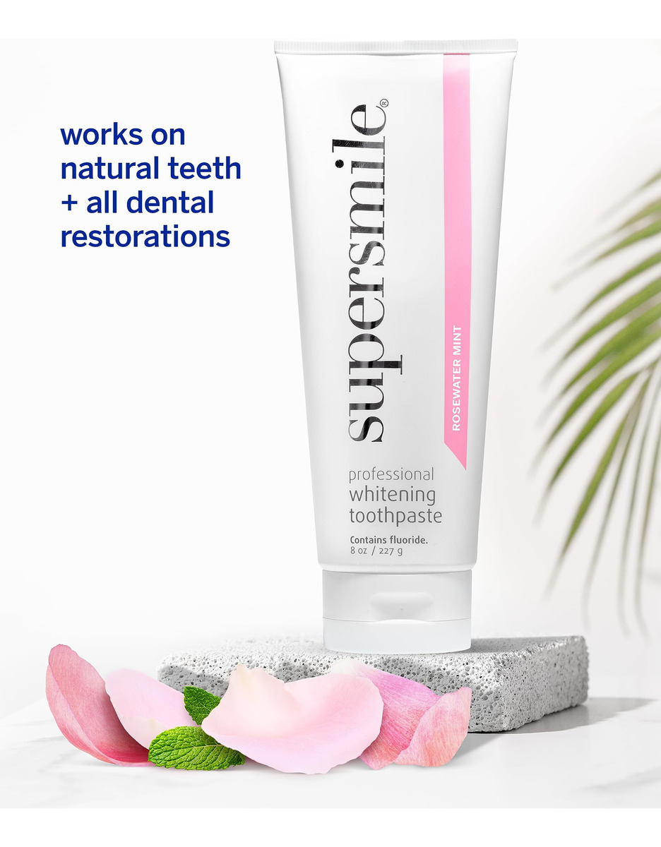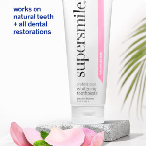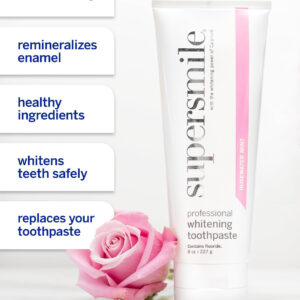 Creme dental branqueador de dentes Supersmile Professional com flúor, água de rosas, 8 onças – clareia os dentes em 6 tons em 5 dias (em média) sem sensibilidade* (e temos estudos que comprovam isso!) – Combate a placa bacteriana 10 vezes melhor do que os principais cremes dentais que removem placas* (porque a placa bacteriana está quebrada) – 75% menos abrasivo do que o limite estabelecido pela ADA* (em uma escala de 0 a 250, somos 65) – Remineraliza + restaura o esmalte enquanto combate as cáries (seu dentista vai adorar) – Faz com que os sorrisos pareçam brilhantes + novos (até mesmo dentaduras, facetas ou colados dentes!)