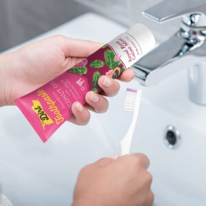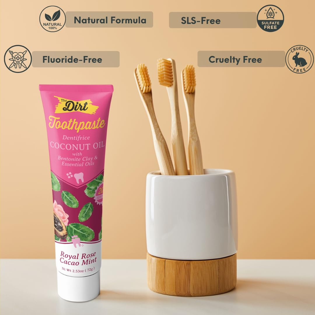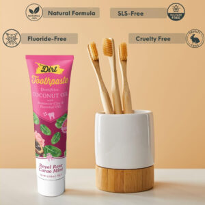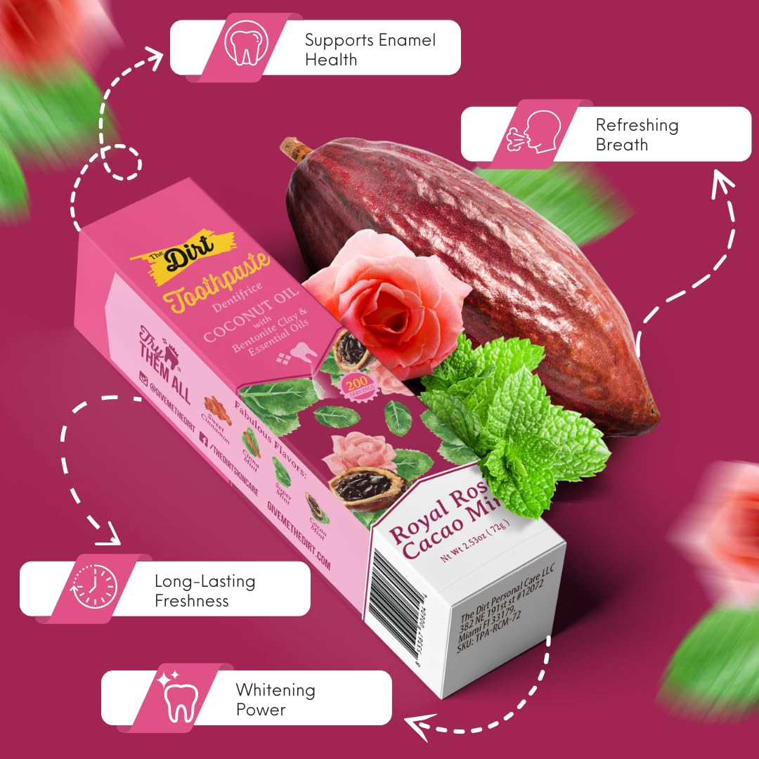 Apresentando o creme dental com óleo de coco THE DIRT no delicioso sabor Rose Cacau Mint, sua solução definitiva para um sorriso naturalmente radiante e saudável. Feito com cuidado, nosso creme dental premium é repleto de ingredientes orgânicos e óleos essenciais, garantindo uma experiência única de higiene bucal que deixará sua boca revigorada e rejuvenescida. Descubra o poder da natureza e adote uma abordagem holística à higiene dental com o creme dental com óleo de coco THE DIRT. Junte-se a milhares de clientes satisfeitos que escolheram THE DIRT para suas necessidades naturais de higiene bucal. Nosso compromisso com a qualidade e a satisfação do cliente nos tornou uma marca confiável no setor. Descubra os benefícios de nosso creme dental com óleo de coco hoje e desfrute de um sorriso mais saudável e confiante. – ÓLEO DE COCO ORGÂNICO: Nosso creme dental aproveita as propriedades de limpeza e nutrição do óleo de coco orgânico, conhecido por sua capacidade de ajudar a manter gengivas saudáveis e combater o mau hálito. O creme dental com óleo de coco Dirts limpa uma camada lisa que protege as gengivas, repele o mau hálito e clareia os dentes. – SABOR DE MENTA DE CACAU ROSA: Experimente a sensação revigorante da hortelã de cacau rosa ao escovar. Nosso creme dental combina a riqueza da hortelã de cacau rosa com o frescor da menta para uma rotina de higiene bucal refrescante e deliciosa. – INGREDIENTES NATURAIS: Nosso creme dental totalmente natural combina as propriedades antibacterianas do óleo MCT (óleo de coco fracionado) com os benefícios naturais de desintoxicação e limpeza da argila bentonítica, que é firme o suficiente para remover a placa bacteriana dos dentes, mas macia o suficiente para não danificar o esmalte. – CLAREAMENTO APRIMORADO: diga adeus às manchas superficiais e olá a um sorriso mais brilhante. O creme dental com óleo de coco DIRT clareia suavemente os dentes ao longo do tempo, revelando uma pessoa naturalmente radiante e confiante. – CUIDADO BUCAL HOLÍSTICO: adote uma abordagem natural e holística da higiene dental. Nosso creme dental promove a saúde bucal geral, ajudando a prevenir cáries, reduzir o acúmulo de placa bacteriana e manter a sensação de frescor na boca.