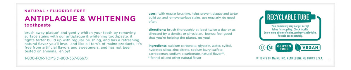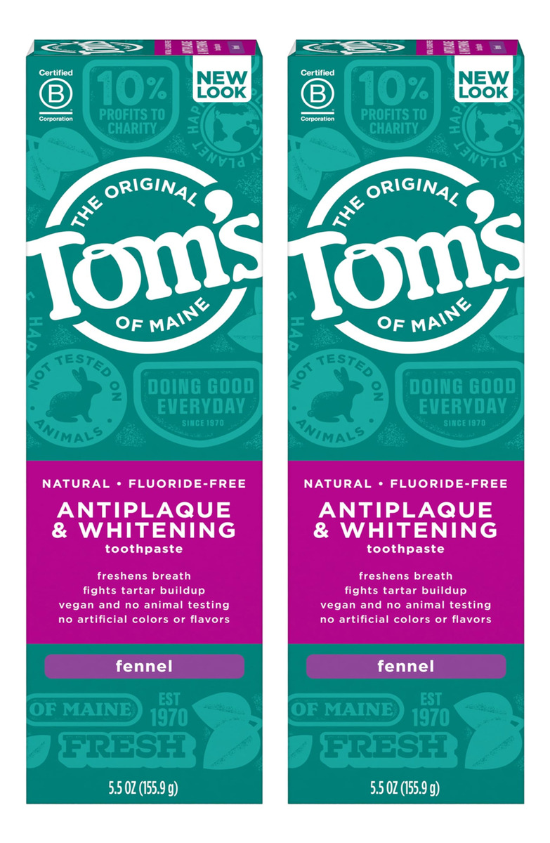 Pasta de dente natural antiplaca e branqueadora sem flúor Tom's of Maine, erva-doce, pacote com 5,5 onças. 2 pacotes — O QUE VOCÊ RECEBERÁ: dois tubos de 5,5 onças de creme dental branqueador e antiplaca natural sem flúor no sabor de erva-doce — PASTA DE DENTE SEM FLÚOR: ajuda a combater o acúmulo de tártaro com fórmula antiplaca – BRANQUEIA OS DENTES: ingredientes de origem natural ajudam a remover manchas superficiais para uma brisa sorriso mais claro e branco – TUBO RECICLÁVEL: procure a bandeira azul de reciclagem, esprema o máximo de pasta de dente que puder, recoloque a tampa e recicle – CUIDE-SE NATURALMENTE: Não contém conservantes, cores ou sabores artificiais e não é testado em animais