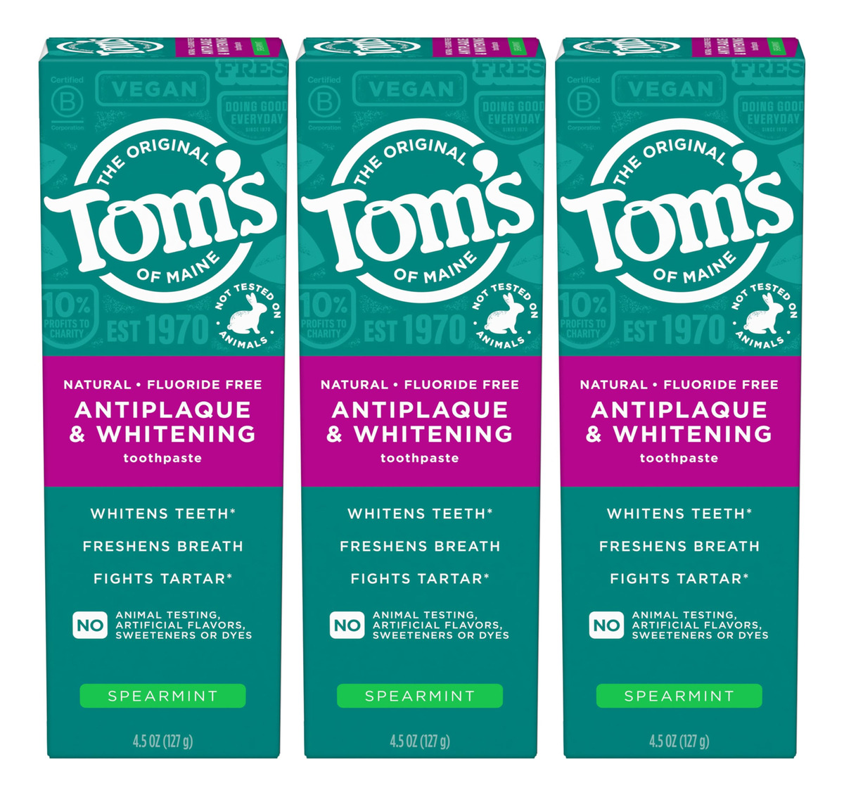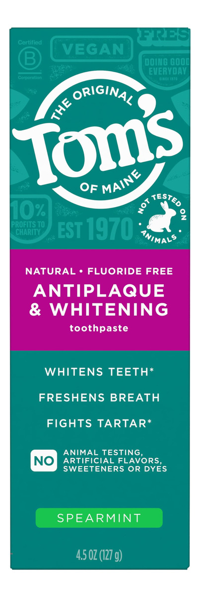Pasta de dente natural antiplaca e branqueadora sem flúor Tom's of Maine, hortelã, 4,5 onças. Pacote com 3 — O sabor refrescante da pasta de dente de hortelã ajuda a refrescar o hálito toda vez que você escova — Feito com ingredientes de origem natural e de origem natural para uma pasta de dente natural sem flúor que você pode se sentir bem ao usar diariamente — A pasta de dente antiplaca bacteriana não contém flúor e ajuda a remover manchas superficiais com escovação regular para ajudar suavemente clarear dentes – Livre de sabores, adoçantes e corantes artificiais e não foi testado em animais – Escolha um clareador natural creme dental adequado às suas necessidades de higiene bucal com este creme dental sem flúor da Toms of Maine – Ingredientes principais: carbonato de cálcio, glicerina, água, xilitol, sílica hidratada, citrato de zinco, laurilsulfato de sódio, carragenina, bicarbonato de sódio, sabor natural – óleo de erva-doce
