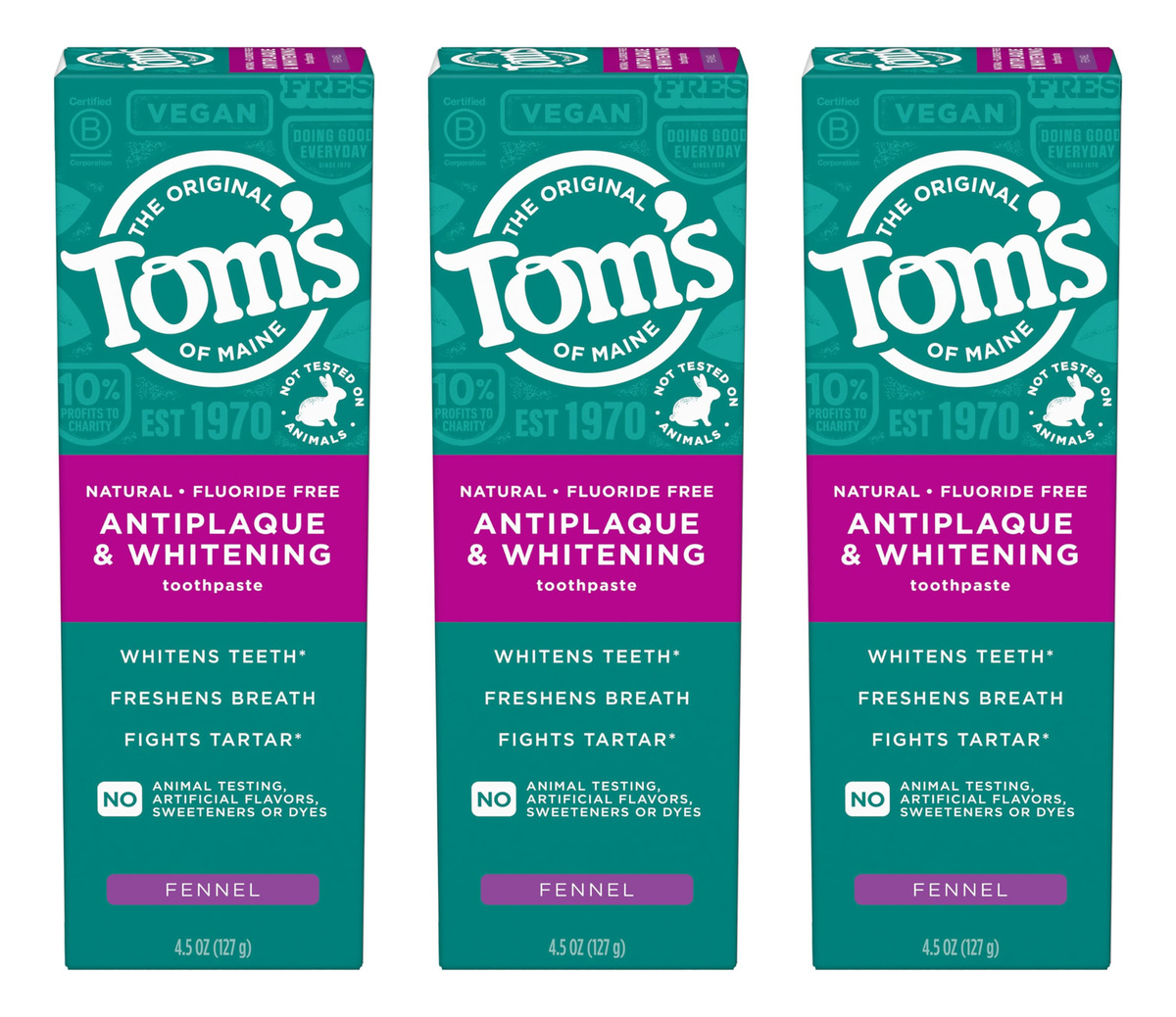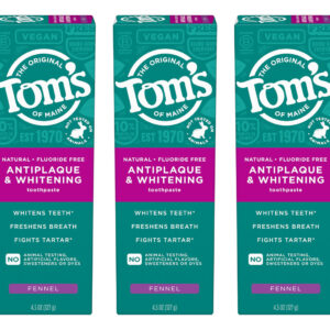 Creme dental antiplaca e branqueador Toms of Maine, sem flúor, erva-doce, pacote com 3, 4,5 onças — Inclui três (3) tubos de 4,5 onças de creme dental antiplaca e branqueador sem flúor da Tom's of Maine — Este creme dental branqueador antiplaca ajuda a clarear os dentes e ajuda a evitar o acúmulo de tártaro com a escovação regular — O sabor doce e herbáceo do creme dental ajuda a refrescar o hálito toda vez que você escova – Feito com ingredientes de origem natural e de origem natural para um creme dental natural sem flúor que você pode se sentir bem usando diariamente – O creme dental anti-placa bacteriana é flúor livre e ajuda a remover manchas superficiais com escovação regular para ajudar a clarear suavemente os dentes – Ingredientes principais: carbonato de cálcio, glicerina, água, xilitol, sílica hidratada, citrato de zinco, laurilsulfato de sódio, carragenina, bicarbonato de sódio, sabor natural – óleo de erva-doce