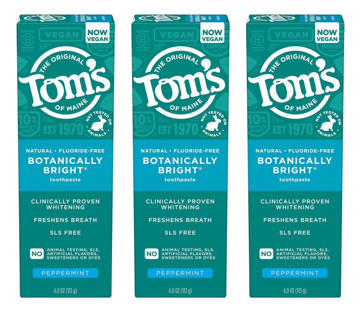 Creme dental branqueador natural Toms of Maine Botanically Bright, sem flúor e sem SLS, vegano, hortelã, pacote com 3, 4,0 onças – Inclui três (3) tubos de 4,0 onças de creme dental Toms of Maine Botanicamente Bright sem flúor – Este pacote de creme dental clareador natural está clinicamente comprovado que ajuda a clarear os dentes – O creme dental sem glúten tem uma fórmula vegana e usa sílica naturalmente derivada da areia para remova manchas superficiais dos dentes – O sabor do creme dental de hortelã usa óleo de hortelã de origem natural e vegetais cuidadosamente escolhidos para proporcionar uma sensação de bem-estar encorpada sabor – Este creme dental sem SLS funciona como um creme dental vegano e não contém sabores, adoçantes ou corantes artificiais e não foi testado em animais