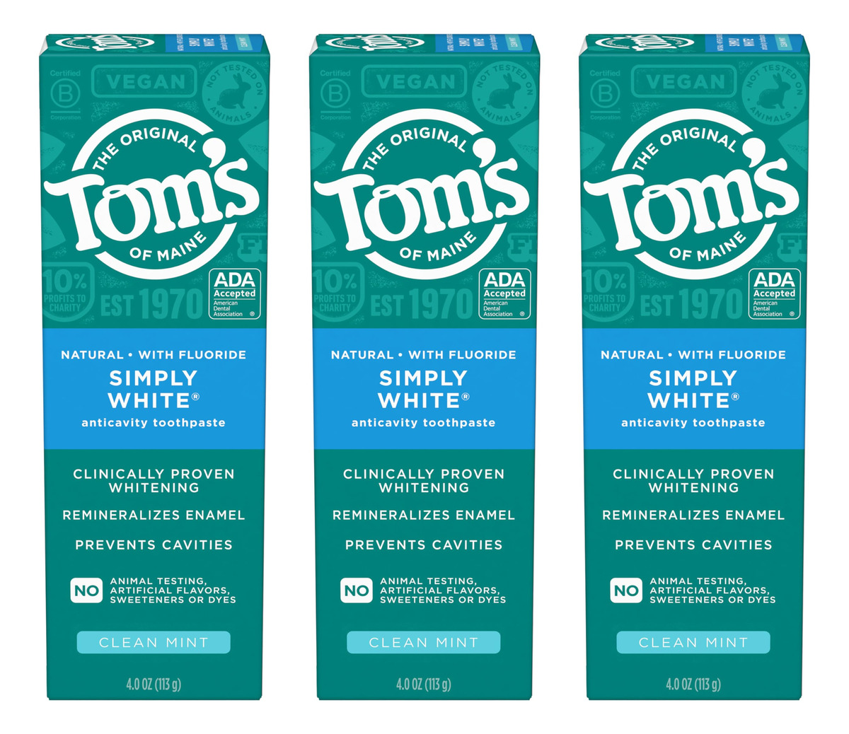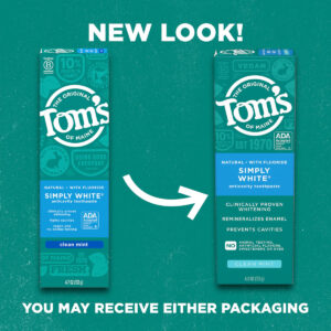 Pasta de dente branqueadora natural Tom's of Maine com flúor, branca simples, menta limpa, pacote com 3, 4,0 onças — Inclui três (3) tubos de 4,0 onças de creme dental anticavity Simply White da Toms of Maine com flúor e pasta de dente limpa — A pasta de dente branqueadora natural contém sílica de origem natural que ajuda a remover manchas superficiais para obter dentes mais brancos – O sabor refrescante do creme dental Clean Mint ajuda a refrescar o hálito toda vez que você escova com este creme dental com flúor – O creme dental anticavity Simply White Mint da Toms of Maine está clinicamente comprovado que ajuda a clarear os dentes – Anticavity a pasta de dente é feita com flúor para ajudar a combater as cáries e ajuda a remover manchas superficiais para deixar os dentes mais brancos