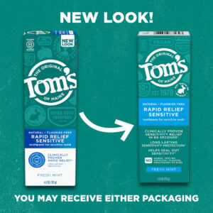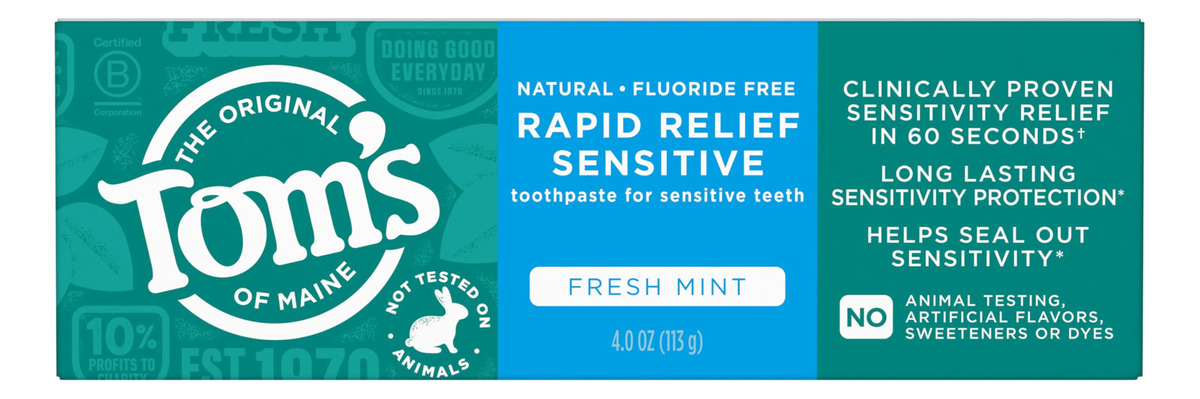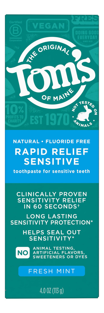 Pasta de dente sensível de alívio rápido sem flúor Tom's of Maine, hortelã fresca, 4 onças (a embalagem pode variar) – O QUE VOCÊ RECEBERÁ: Um tubo de 4 onças de creme dental sensível Tom's of Maine Rapid Relief com sabor de menta fresca – PASTA DE DENTES SENSÍVEL: A fórmula clinicamente comprovada oferece proteção duradoura com o uso regular – INGREDIENTES DE ORIGEM NATURAL: arginina e carbonato de cálcio selam vias para ajudar a bloquear a dor – PARA ALÍVIO RÁPIDO: aplique a pasta de dente diretamente em massageie suavemente os dentes por um minuto – NATURAL E RESPONSÁVEL: Não contém conservantes artificiais, corantes ou sabores e não é testado em animais
