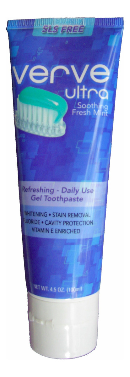 Verve, creme dental premium sem laurilsulfato de sódio, é enriquecido com vitamina E e formulado para o uso diário. A formulação suave de clareamento e flúor da Verve combate as cáries e limpa e remove manchas superficiais com eficácia. O sabor é fresco e limpo, não calcário. Livre de SLS e livre de cocamidopropil betaína, Verve é o creme dental ideal para pessoas que sofrem de aftas. Também não contém glúten e não é testado em animais. A Verve é fabricada nos EUA. – Creme dental sem SLS, fórmula não irritante – Flúor para evitar cáries – Sabor suave de menta fresca – Remoção eficaz de manchas – Enriquecido com vitamina E, não contém produtos de origem animal, fabricado nos EUA
