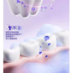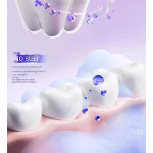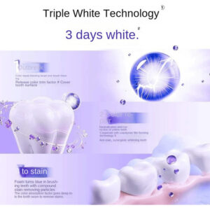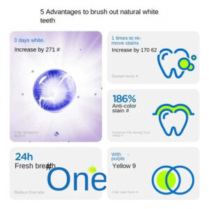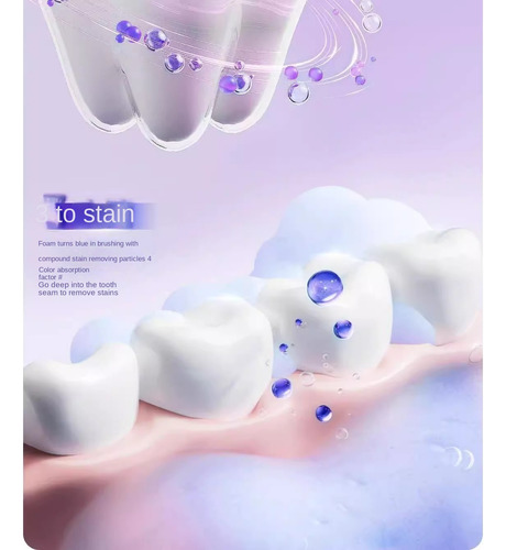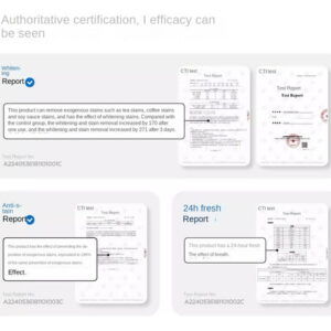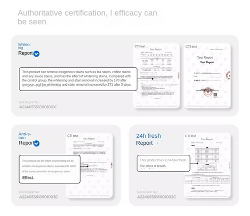 remoção única de manchas aumenta em 170%, a tecnologia de formação de filme de copolímero evita manchas em 186% e a absorção de cor aumenta o clareamento em 271% em 3 dias.