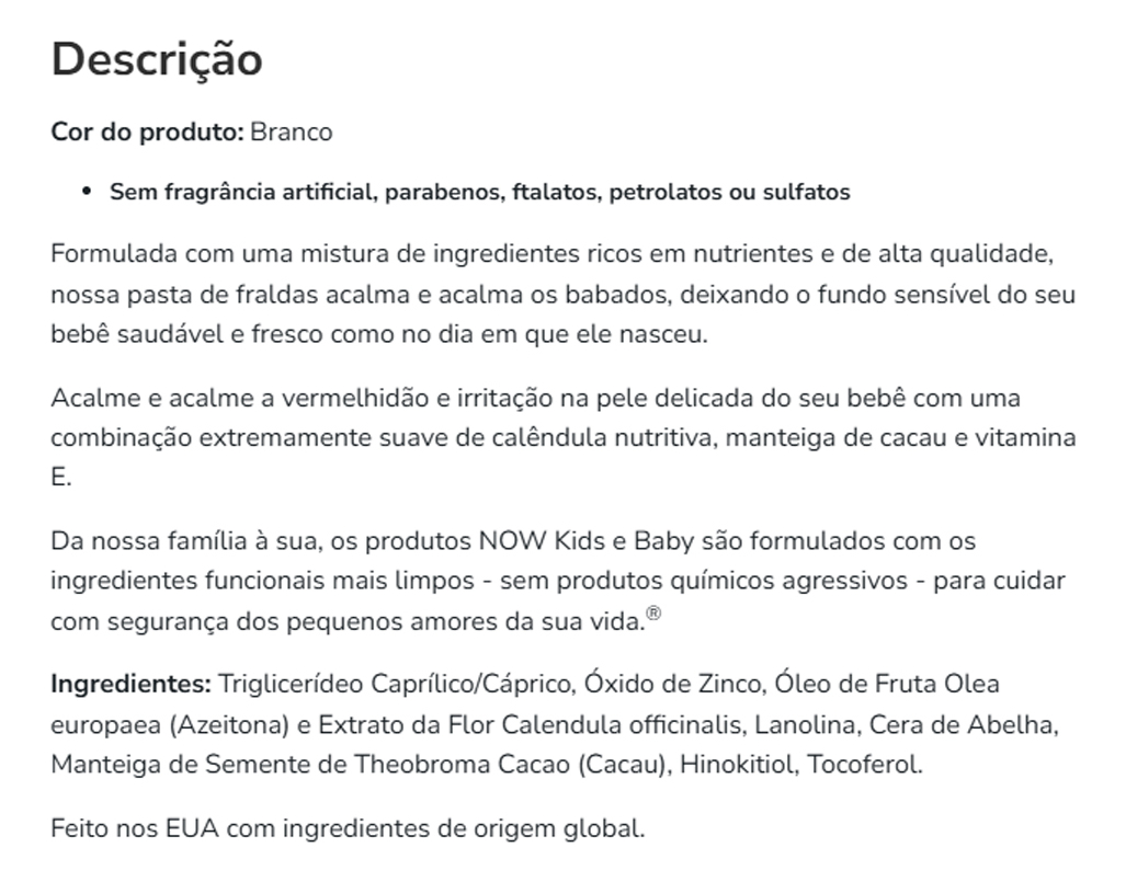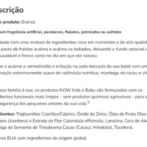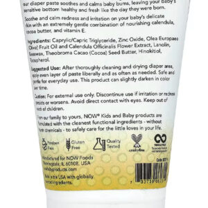 Esta pasta contém ingredientes cuidadosamente selecionados para proporcionar o máximo cuidado à pele do seu bebê. A fórmula de Now Foods é conhecida por seu rigor e compromisso com a segurança, garantindo um produto confiável e eficaz. Validade longa