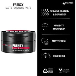 Pasta texturizante fosca SexyHair Style Frenzy, 2,5 onças | Plenitude, textura e definição | Ajuda a criar volume | Semi-fosca – Comprimento da embalagem do item: 4,064 cm – Largura da embalagem do item: 6,985 cm – Altura da embalagem do item: 6,985 cm – Peso da embalagem do item: 0,113 kg