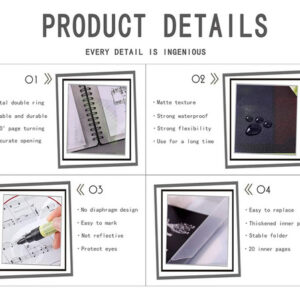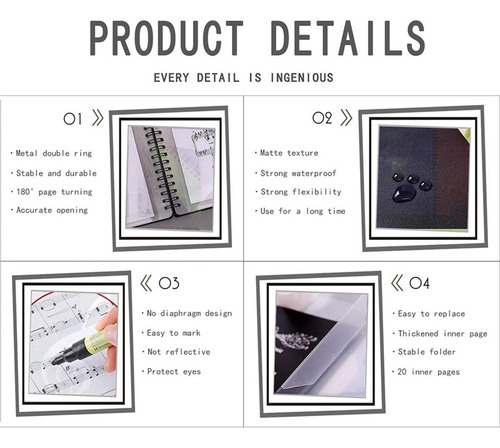 A pasta de partituras adota encadernação em espiral de anel duplo de metal, a posição de abertura é precisa, não é fácil de afrouxar e a partitura pode ser facilmente revestida em 180 graus.