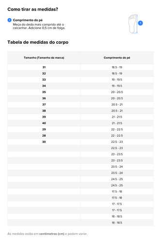18, 5cm = EU 29 19 cm = 30 19, 5cm = EU 31