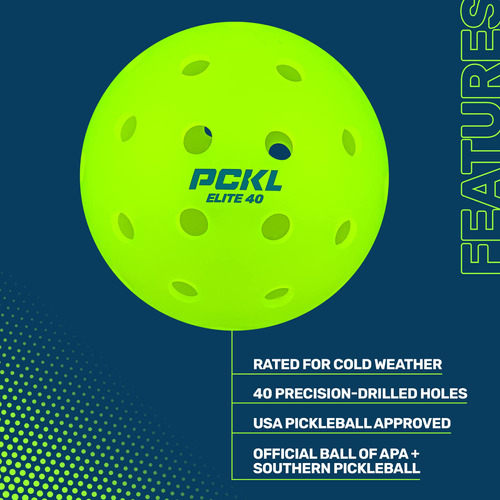 PCKL Elite 40 Pickleballs are designed for competitive and tournament play. These high-speed pickleballs are USA Pickleball approved, have a firmer feel off the paddle and are exceptionally durable, game after game. This is the official ball of the APA and Southern Pickleball Association. 4 balls per pack. – 4 PACK OF PICKLEBLALL BALLS – This set includes four (4) high-speed pickleballs with 40 perfectly spaced, precision drilled-holes for consistent play and flight in all conditions. – LASTS LONGER – Designed for durability with a one-piece construction and industry exclusive blend of materials that cracks less than competitors, especially in cold temperatures. – HIGH VISIBILITY – Vibrant neon color is highly visible and easily tracked so you can keep your eye on the ball and react faster. – TOURNAMENT READY – Elite 40 is ideally constructed for hard-hitting tournament play with USA Pickleball approved specs: 74mm in size and 26 grams in weight. – OFFICIAL BALL – Elite 40 is the official pickleball of the Amateur Pickleball Association and the Southern Pickleball Association.