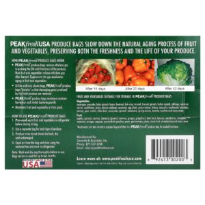 - Os sacos de produtos PEAKfresh® removem o gás etileno para prolongar a vida e o frescor dos produtos. A maioria das frutas e vegetais libera gás etileno após a colheita. A exposição ao gás acelera o envelhecimento em frutas e vegetais.