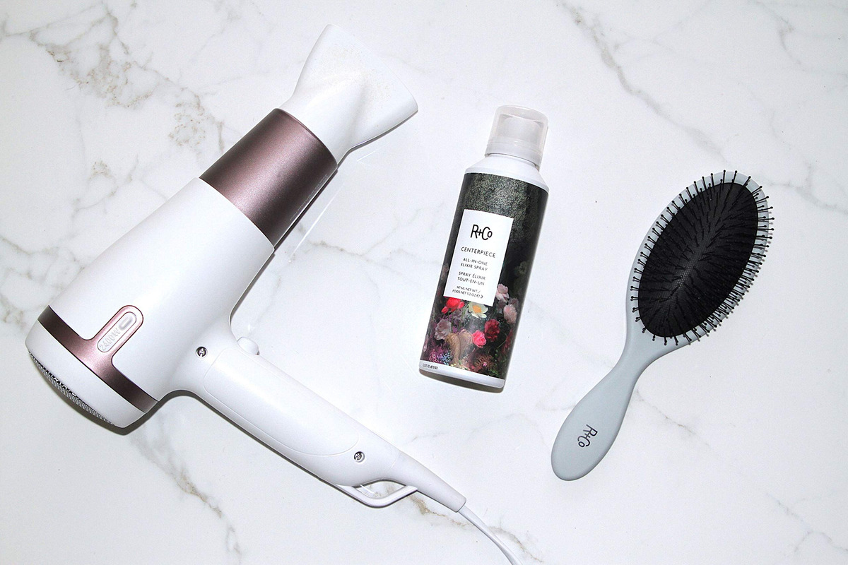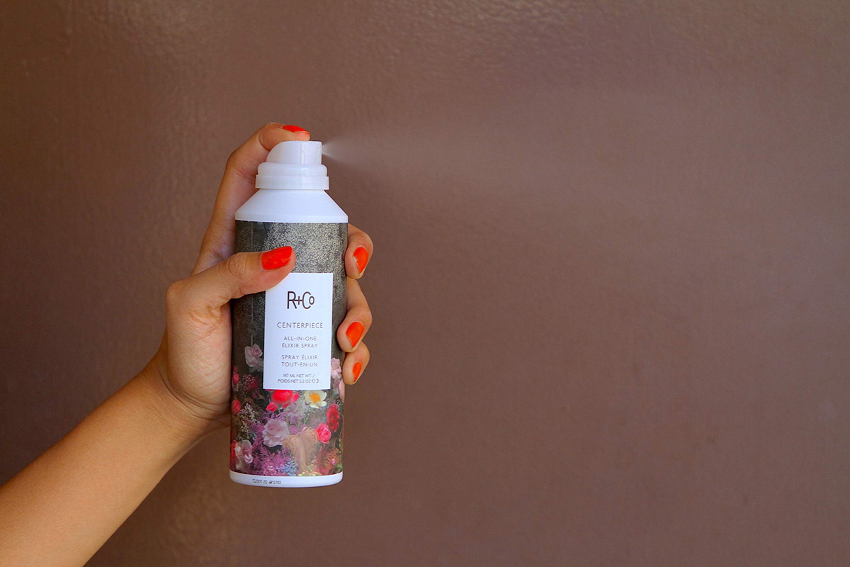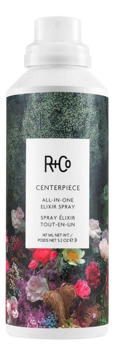 Spray de elixir multifuncional R+Co CENTERPIECE 147 ml/5,2 oz — O óleo de espinheiro marítimo fornece hidratação, retém a umidade e melhora a força do cabelo — O extrato de casca de limão suaviza a cutícula do cabelo enquanto absorve o sebo para um brilho leve, maciez e proteção antioxidante — O extrato de cana-de-açúcar oferece um acabamento suave, brilhante e refletivo