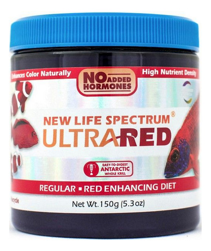 O New Life Spectrum Ultra Red é especialmente formulado para intensificar a pigmentação vermelha em seus peixes. Esta dieta diária nutricionalmente balanceada contém ingredientes naturais que melhoram a cor para ajudar a obter e manter tons vermelhos ricos e vivos. Esses grânulos de absorção lenta são feitos com proteínas inteiras de krill e arenque de fácil digestão, enriquecidos com uma ampla gama de vitaminas e minerais para promover coloração, saúde e vitalidade excepcionais. Formulado para todos os tipos de ciclídeos onívoros, herbívoros e carnívoros. Ideal para espécies de água doce e salgada. Não contém adição de hormônios, corantes ou agentes corantes artificiais. Alta nutrição densidade para menos desperdício e água mais limpa Feito nos Brasil Farinha de krill antártico integral, farinha de arenque integral, farinha de trigo integral, farinha de algas, betacaroteno, espirulina, alho, Extrato de vegetais e frutas (espinafre, repolho vermelho e verde, ervilha, brócolis, pimenta vermelha, abobrinha, tomate, kiwi, damasco, pera, manga, maçã, mamão, pêssego), acetato de vitamina A, DL alfatocofero (E), suplemento de vitamina B-12 de esterol animal ativado D (D3), niacina, ácido fólico, biotina, tiamina, Suplemento de riboflavina, cloridrato de piridoxina, pantotenato de cálcio, L-ascorby-2-polifosfato (C estável), cloreto de colina, proteinato de cobre, dihidroiodeto de etilenodiamina, sulfato de cobalto, sulfato ferroso, sulfato de manganês.