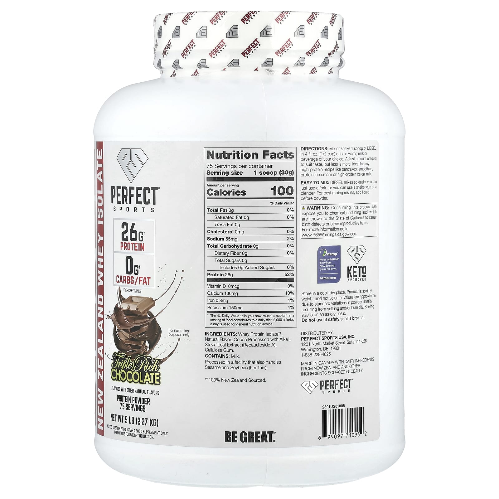 PERFECT Sports Diesel Isolado de Whey da Nova Zelândia Chocolate Triplamente Rico 227 g (5 lbs) – PERFECT Sports Nutrição Esportiva Proteína Proteína Whey Isolado protéico de soro de leite.