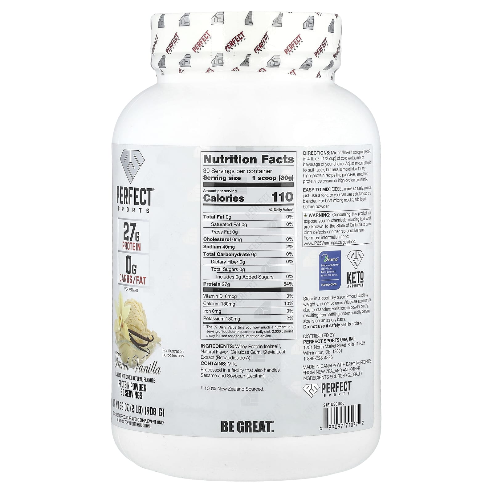 PERFECT Sports Óleo do Isolado de Whey da Nova Zelândia Baunilha Francesa 908 g (2 lb) – PERFECT Sports Nutrição Esportiva Proteína Proteína Whey Isolado protéico de soro de leite.