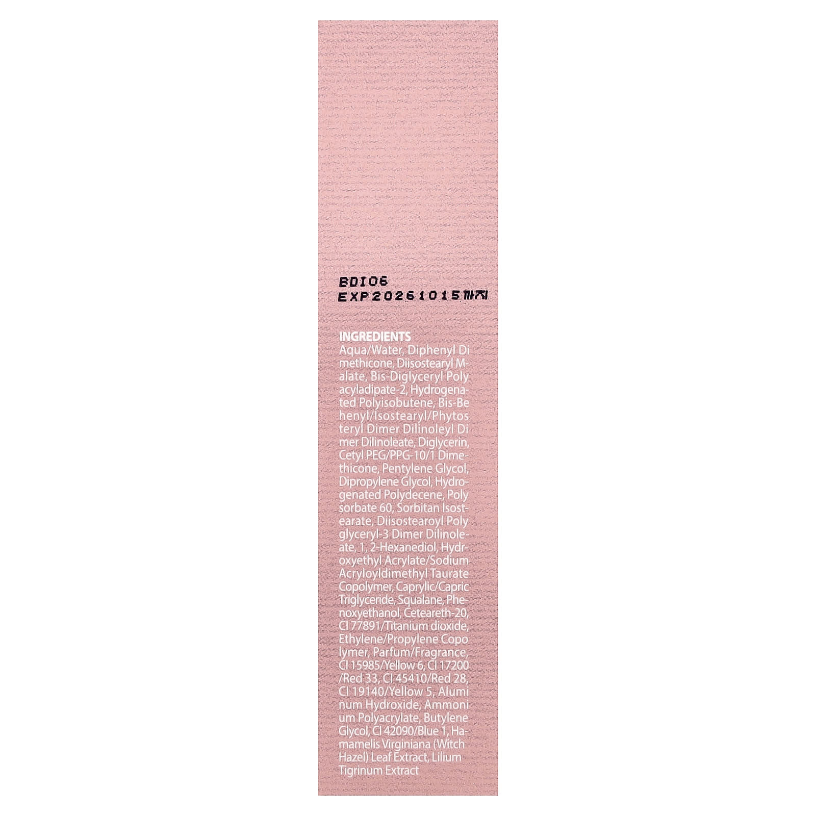 Água, difenil dimeticona, diisostearyl malate, bis-diglyceryl polyacyladipate-2, poliisobuteno hidrogenado, bis-behenyl/isostearyl/phytosteryl dimer dilinoleyl dimer dilinoleate, diacilglicerol, cetyl peg/ppg-10/1 dimethicone, pentilenoglicol, dimetildietilenoglicol, hydrogenated polydecene, polissorbato 60, isoestearato de sorbitana, dilinoleato de diisoestearoil poliglicerila-3, 1,2-hexanediol, copolímero de acriloildimetiltaurato de sódio e acrilato de hidroxietila, caprylic/capric triglyceride, esqualano, fenoxietanol, ceteareth-20 CI 77891/dióxido de titânio, copolímero de etileno/propileno, perfume/fragrância, CI 15985/amarelo 6, CI 17200/vermelho 33, CI 45410/vermelho 28, CI 19140/amarelo 5, hidróxido de alumínio, poliacrilato de amônio, butilenoglicol, CI 42090/azul 1, extrato da folha de Hamamelis virginiana (hamamélis), extrato de Lilium tigrinum.