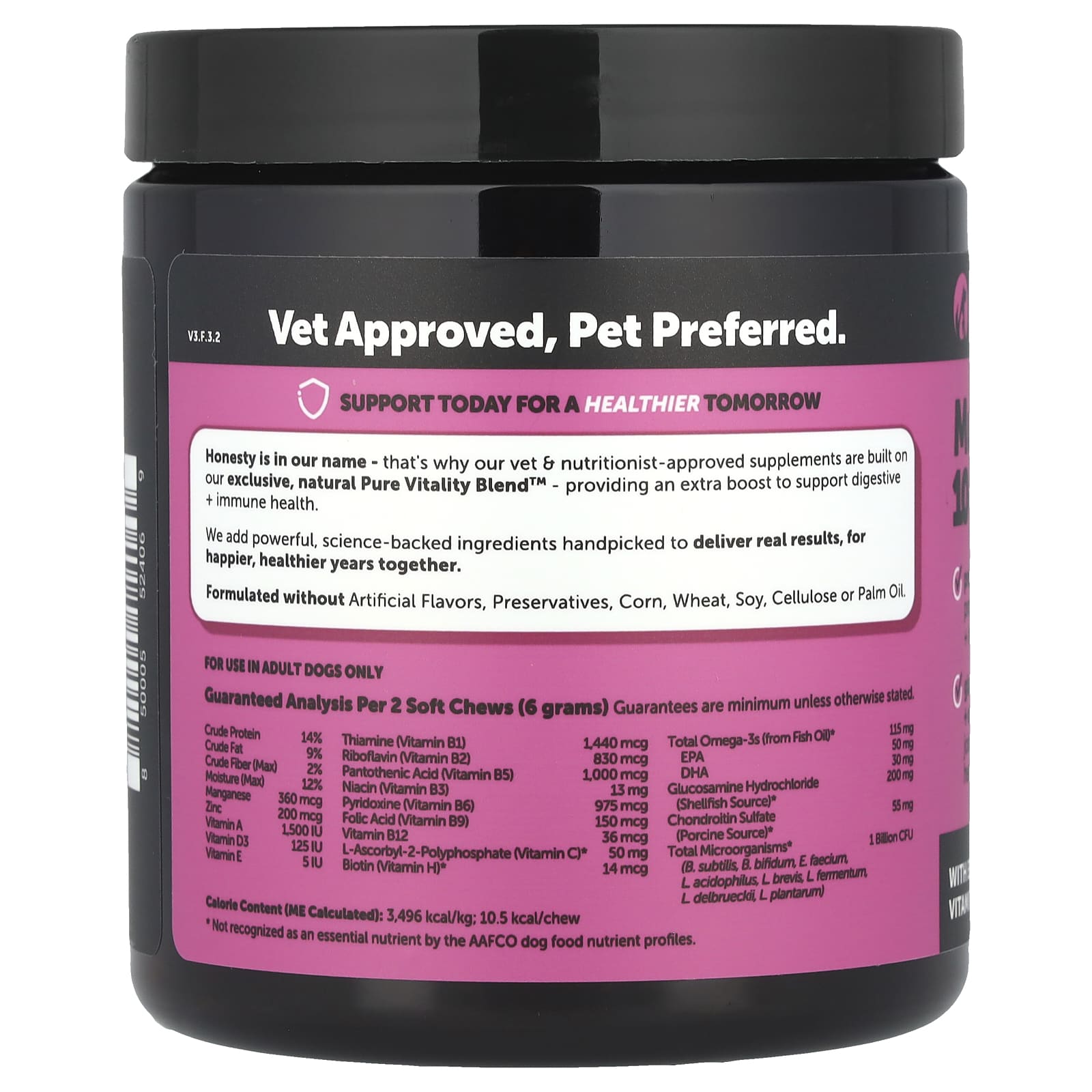 Farinha de aveia, glicerina vegetal, levedura de cerveja, yuca, lecitina de girassol, cloridrato de glicosamina, óleo de peixe, óleo de coco, sabor natural, l-ascorbyl-2-polyphosphate, sabor natural de frango, sulfato de condroitina, ácido cítrico, vinagre, abóbora, batata-doce, ácido nicotínico, produto de fermentação de Bacillus subtilis seco, produto de fermentação de Bifidobacterium bifidum seco, produto de fermentação de Enterococcus faecium seco, produto de fermentação de Lactobacillus acidophilus seco, produto de fermentação de Lactobacillus brevis seco, produto de fermentação de Lactobacillus fermentum seco, produto de fermentação de Lactobacillus delbrueckii seco, produto de fermentação de Lactobacillus plantarum seco, tocoferóis mistos (conservante), suplemento de vitamina A, suplemento de vitamina E, proteinato de manganês, mononitrato de tiamina, biotina, suplemento de vitamina D3, proteinato de zinco, pantotenato de cálcio, cloridrato de piridoxina, riboflavina, ácido fólico, vitamina B12.