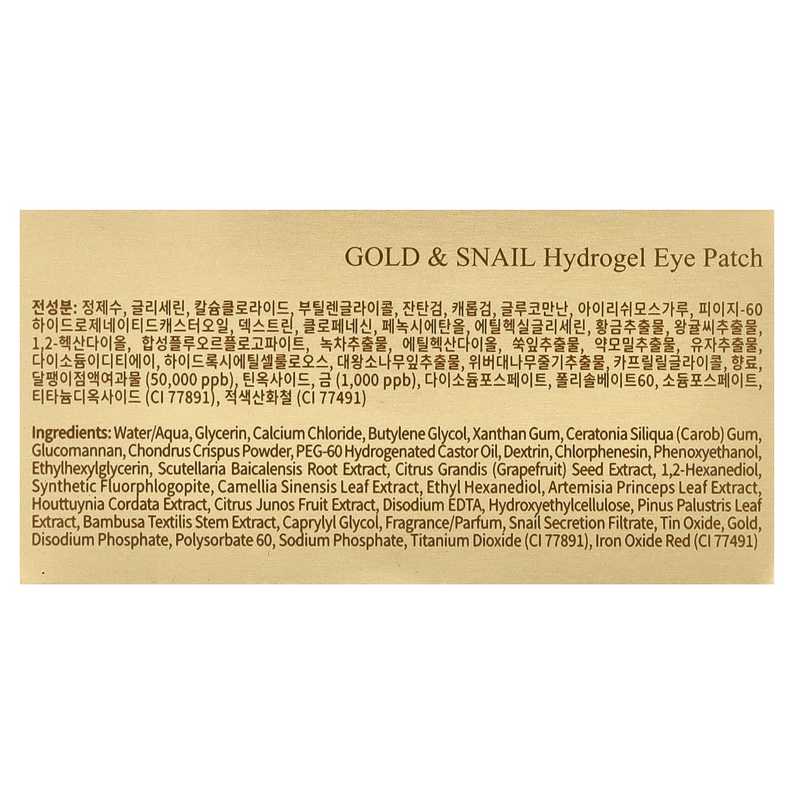 Água/aqua, glicerina, cloreto de cálcio, butilenoglicol, goma xantana, glucomanano de goma de Ceratonia siliqua (alfarroba), pó de Chondrus crispus, óleo de rícino hidrogenado peg-60, dextrina, clorfenesina, fenoxietanol, ethylhexylglycerin, extrato da raiz de Scutellaria baicalensis, extrato da semente de Citrus grandis (pomelo), 1,2-hexanediol, synthetic fluorphlogopite, extrato da folha de Camellia sinensis, ethyl hexanediol, extrato da folha de Artemisia princeps, extrato de Houttuynia cordata, extrato da fruta de Citrus junos, edetato dissódico, hietelose, extrato da folha de Pinus palustris, extrato do caule de Bambusa textilis, caprylyl glycol, fragrância/perfume, filtrado de secreção de caracol, óxido de estanho, ouro, fosfato dissódico, polissorbato 60, fosfato de sódio, dióxido de titânio (CI 77891), vermelho de óxido de ferro (CI 77491).