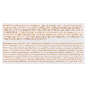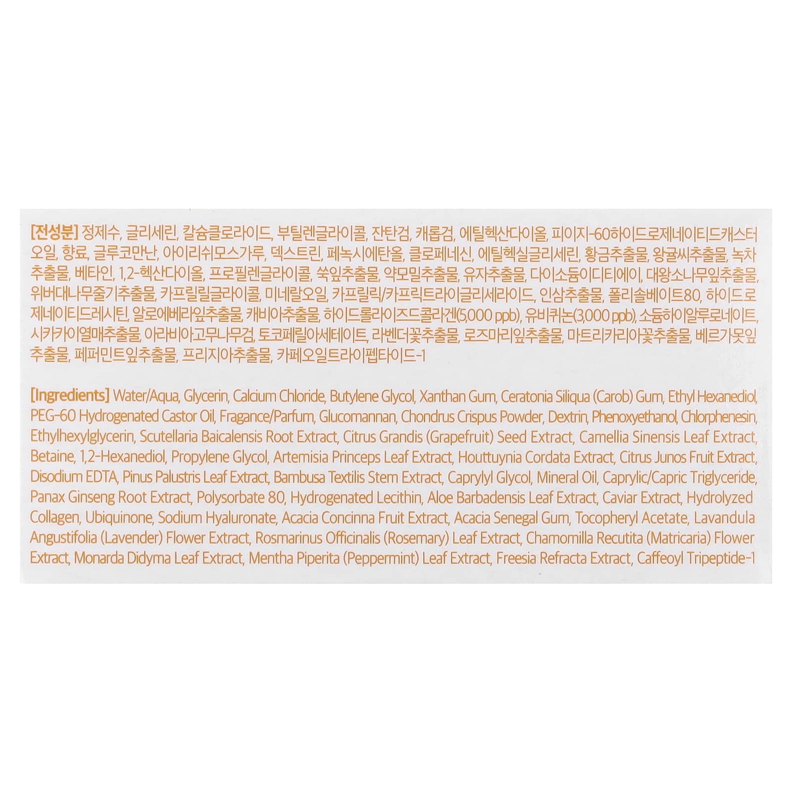 Água, glicerina, cloreto de cálcio, butilenoglicol, goma xantana, goma de Ceratonia siliqua (alfarroba), ethyl hexanediol, óleo de rícino hidrogenado peg-60, fragrância/perfume, glucomannan, pó de Chondrus crispus, dextrina, fenoxietanol, clorfenesina, ethylhexylglycerin, extrato da raiz de Scutellaria baicalensis, extrato da semente de Citrus grandis (pomelo), extrato da folha de Camellia sinensis, betaína, 1,2-hexanediol, propilenoglicol, extrato da folha de Artemisia princeps, extrato de Houttuynia cordata, extrato da fruta de Citrus junos, edetato dissódico, extrato da folha de Pinus palustris, extrato do caule de Bambusa textilis, caprylyl glycol, óleo mineral, caprylic/capric triglyceride, extrato da raiz de Panax ginseng, polissorbato 80, lecitina hidrogenada, extrato da folha de Aloe barbadensis, extrato de caviar, colágeno hidrolisado, ubiquinona, hialuronato de sódio, extrato da fruta de Acacia concinna, goma de acácia-do-senegal, acetato de tocoferol, extrato da flor de Lavandula angustifolia (lavanda), extrato da folha de Rosmarinus officinalis (alecrim), extrato da flor de Chamomilla recutita (matricária), extrato da folha de Monarda %idyma, extrato da folha de Mentha piperita (hortelã-pimenta), extrato de Freesia refracta, tripeptídeo-1 de cafeína.
