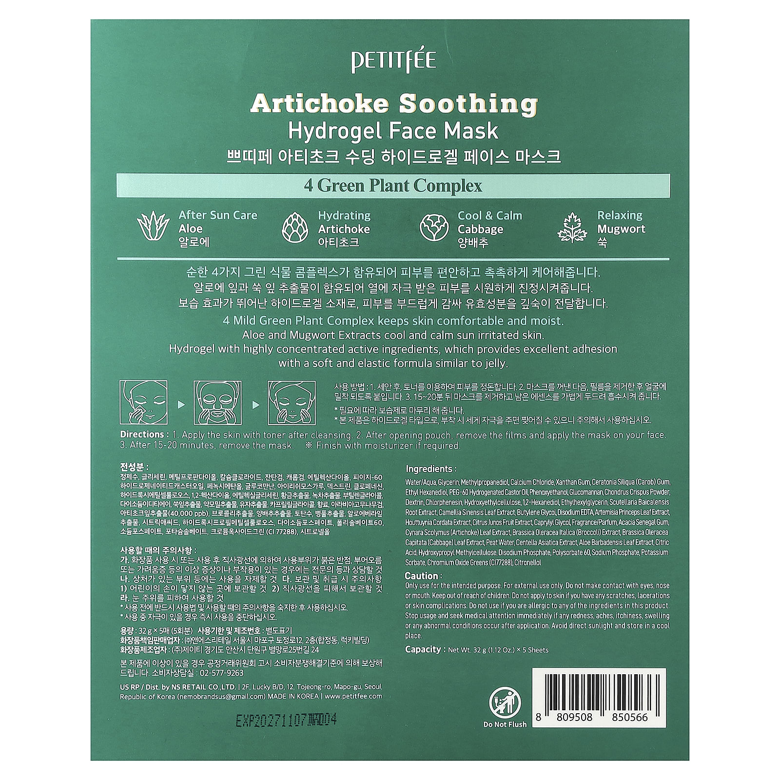 Petitfee Alcachofra Máscara Facial de Beleza de Hidrogel 5 Folhas 32 g (112 oz) Cada – Petitfee Beleza Máscaras Faciais de Beleza Máscaras Faciais Máscaras em folha K-Beauty.