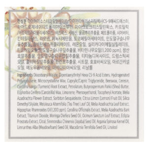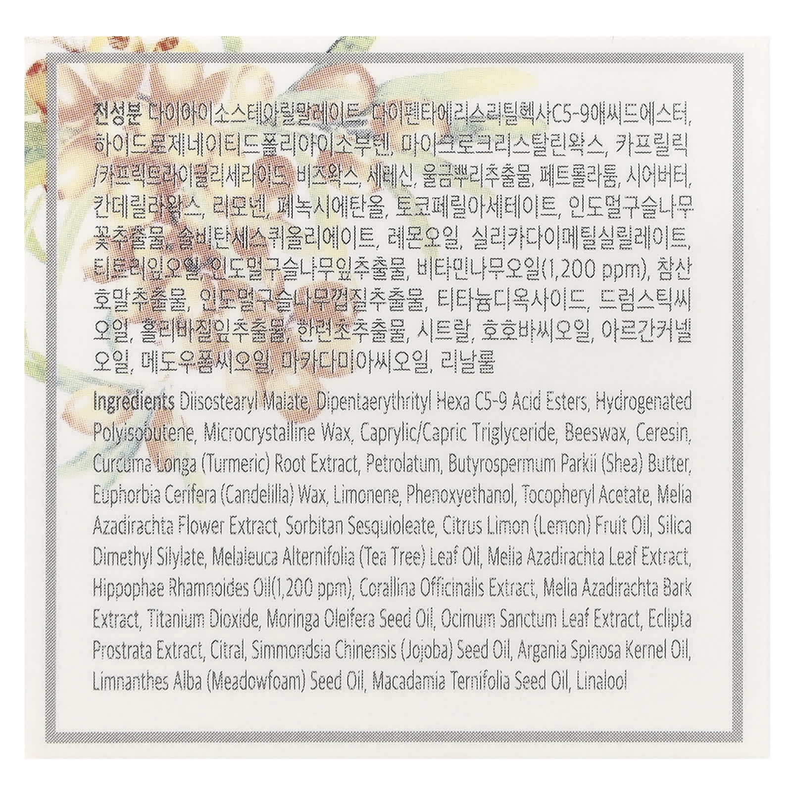 diisostearyl malate, dipentaerythrityl hexa c5-9 acid esters, poliisobuteno hidrogenado, cera microcristalina, caprylic/capric triglyceride, cera de abelha, ceresina, extrato da raiz de Curcuma longa (cúrcuma), petrolato, manteiga de Butyrospermum parkii (karité), cera de Euphorbia cerifera (candelila), limoneno, fenoxietanol, acetato de tocoferol, extrato da flor de Melia azadirachta, sesquioleato de sorbitana, óleo da fruta de Citrus limon (limão), silica dimethyl silylate, óleo da folha de Melaleuca alternifolia (melaleuca), extrato da folha de Melia azadirachta, óleo de Hippophae rhamnoides (1.200 ppm), extrato de Corallina officinalis, extrato da casca de Melia azadirachta, dióxido de titânio, óleo da semente de Moringa oleifera, extrato da folha de Ocimum sanctum, extrato de Eclipta prostrata, citral, óleo da semente de Simmondsia chinensis (jojoba), óleo do grão de Argania spinosa, óleo da semente de Limnanthes alba (meadowfoam), óleo da semente de Macadamia ternifolia, linalol.