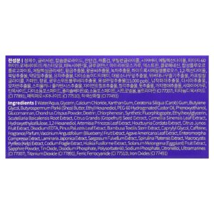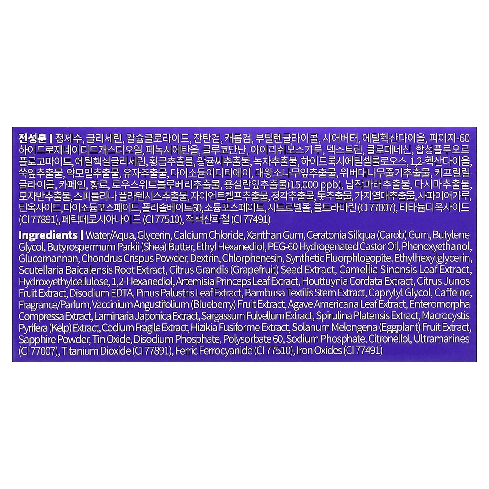 Água, glicerina, cloreto de cálcio, goma xantana, goma de Ceratonia siliqua (alfarroba), butilenoglicol, manteiga de Butyrospermum parkii (karité), ethyl hexanediol, óleo de rícino hidrogenado peg-60, fenoxietanol, glucomannan, pó de Chondrus crispus, dextrina, clorfenesina, synthetic fluorphlogopite, ethylhexylglycerin, extrato da raiz de Scutellaria baicalensis, extrato da semente de Citrus grandis (pomelo), extrato da folha de Camellia sinensis, hietelose, 1,2-hexanediol, extrato da folha de Artemisia princeps, extrato de Houttuynia cordata, extrato da fruta de Citrus junos, edetato dissódico, extrato da folha de Pinus palustris, extrato do caule de Bambusa textilis, caprylyl glycol, cafeína, fragrância/perfume, extrato da fruta de Vaccinium angustifolium (mirtilo), extrato da folha de Agave americana, extrato de Enteromorpha compressa, extrato de Laminaria japonica, extrato de Sargassum fulvellum, extrato de Spirulina platensis, extrato de Macrocystis pyrifera (alga castanha), extrato de Codium fragile, extrato de Hizikia fusiforme, extrato da fruta de Solanum melongena (berinjela), pó de safira, óxido de estanho, fosfato dissódico, polissorbato 60, fosfato de sódio, citronelol, ultramarines (CI 77007), dióxido de titânio (CI 77891), azul da prússia (CI 77510), óxidos de ferro (CI 77491).