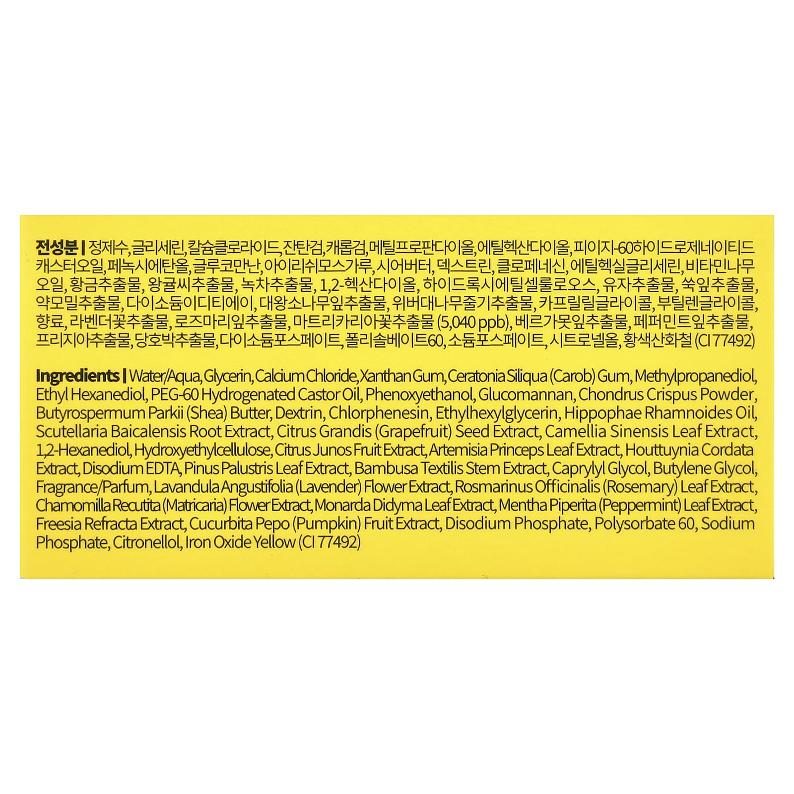 Água/aqua, glicerina, cloreto de cálcio, goma xantana, goma de Ceratonia siliqua (alfarroba), methylpropanediol, ethyl hexanediol, óleo de rícino hidrogenado peg-60, fenoxietanol, glucomannan, pó de Chondrus crispus, manteiga de Butyrospermum parkii (karité), dextrina, clorfenesina, ethylhexylglycerin, óleo de Hippophae rhamnoides, extrato da raiz de Scutellaria baicalensis, extrato da semente de Citrus grandis (pomelo), extrato da folha de Camellia sinensis, 1,2-hexanediol, hietelose, extrato da fruta de Citrus junos, extrato da folha de Artemisia princeps, extrato de Houttuynia cordata, edetato dissódico, extrato da folha de Pinus palustris, extrato do caule de Bambusa textilis, caprylyl glycol, butilenoglicol, fragrância/perfume, extrato da flor de Lavandula angustifolia (lavanda), extrato da folha de Rosmarinus officinalis (alecrim), extrato da flor de Chamomilla recutita (matricária), extrato da folha de Monarda %idyma, extrato da folha de Mentha piperita (hortelã-pimenta), extrato de Freesia refracta, extrato da fruta de Cucurbita pepo (abóbora), fosfato dissódico, polissorbato 60, fosfato de sódio, citronelol, amarelo de óxido de ferro (CI 77492).