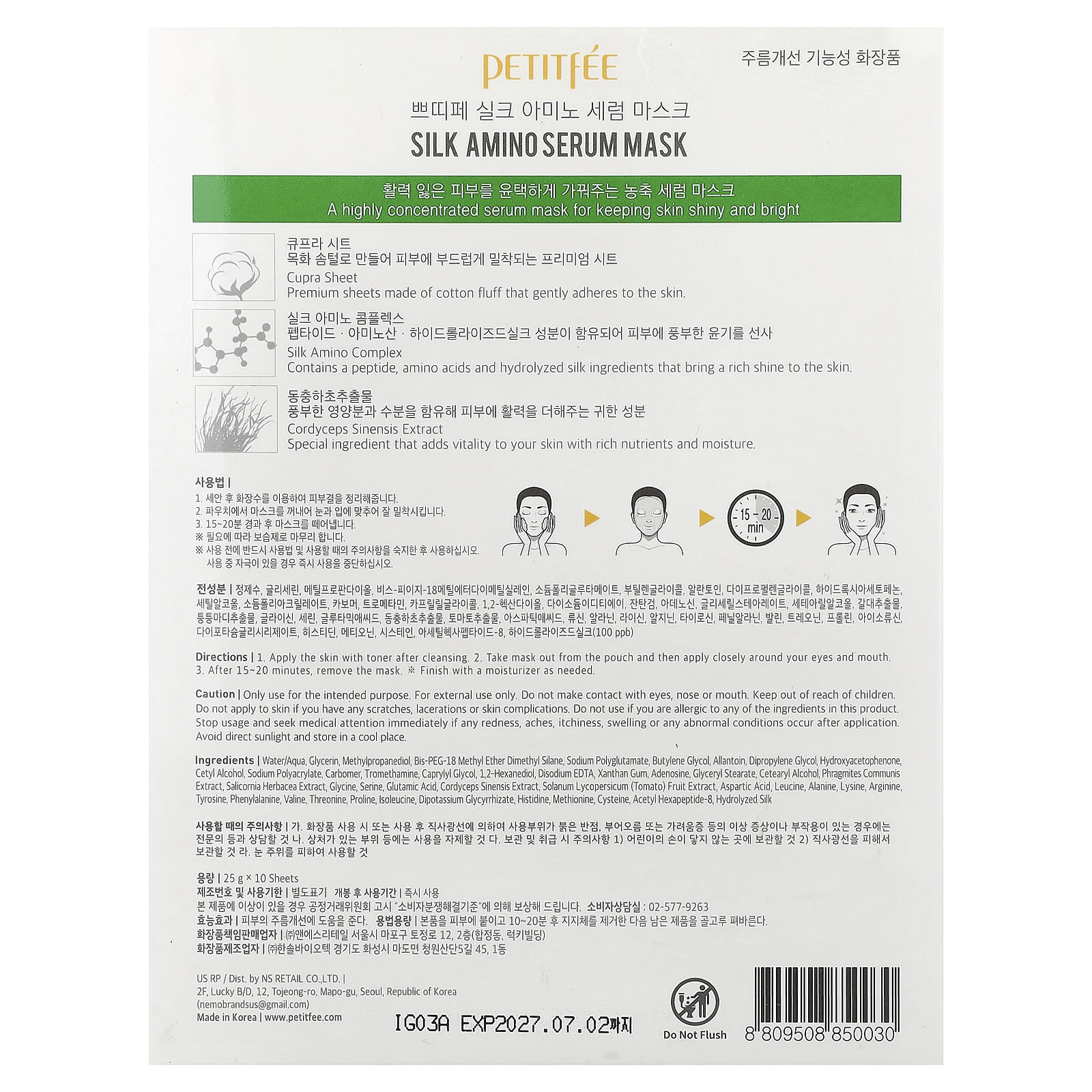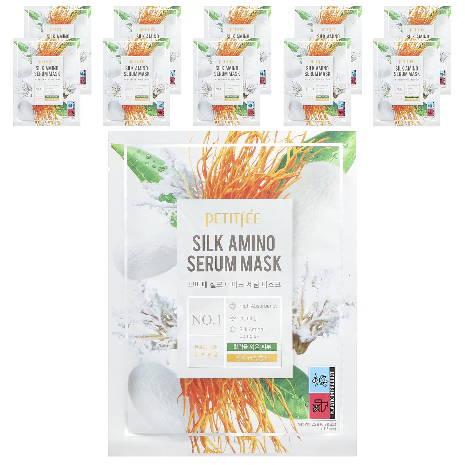 Petitfee Sérum Máscara de Beleza Amino da Seda 10 Folhas 25 g (088 oz) Cada – Petitfee Beleza Máscaras Faciais de Beleza Máscaras Faciais Máscaras em folha K-Beauty.