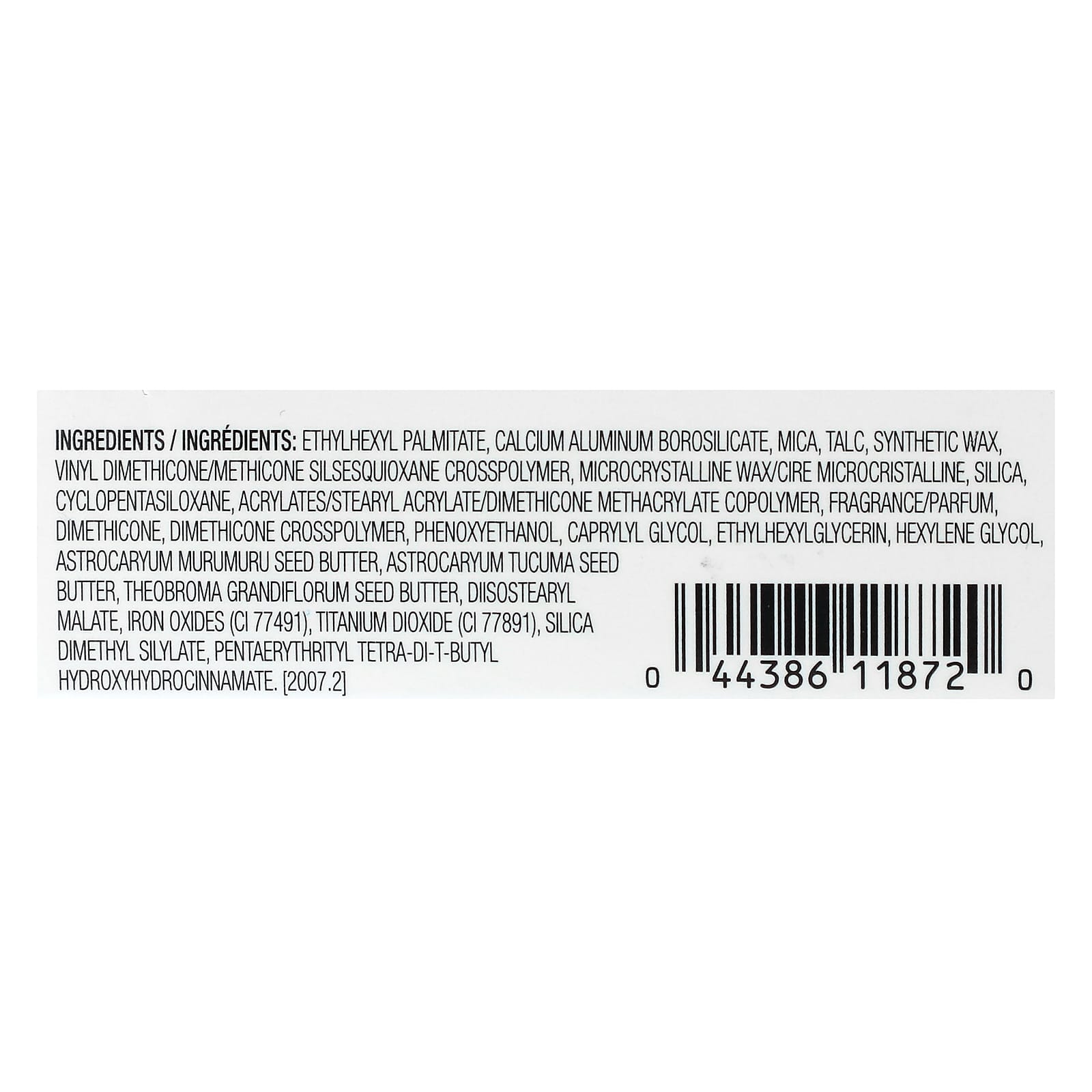 Ethylhexyl palmitate, calcium aluminum borosilicate, mica, talco, cera sintética, vinyl dimethicone/methicone silsesquioxane crosspolymer, cera microcristalina, sílica, decametilciclopentasiloxano, acrilatos/acrilato de estearilo/copolímero de metacrilato de dimeticona, fragrância, dimeticona, crospolímero de dimeticona, fenoxietanol, caprylyl glycol, ethylhexylglycerin, hexylene glycol, manteiga da semente de Murumuru astrocaryum, manteiga de semente de Astrocaryum tucuma, manteiga de semente de Theobroma grandiflorum, diisostearyl malate, óxidos de ferro (CI 77491), dióxido de titânio (CI 77891), silica dimethyl silylate, pentaerythrityl tetra-di-t-butyl hydroxyhydrocinnamate.